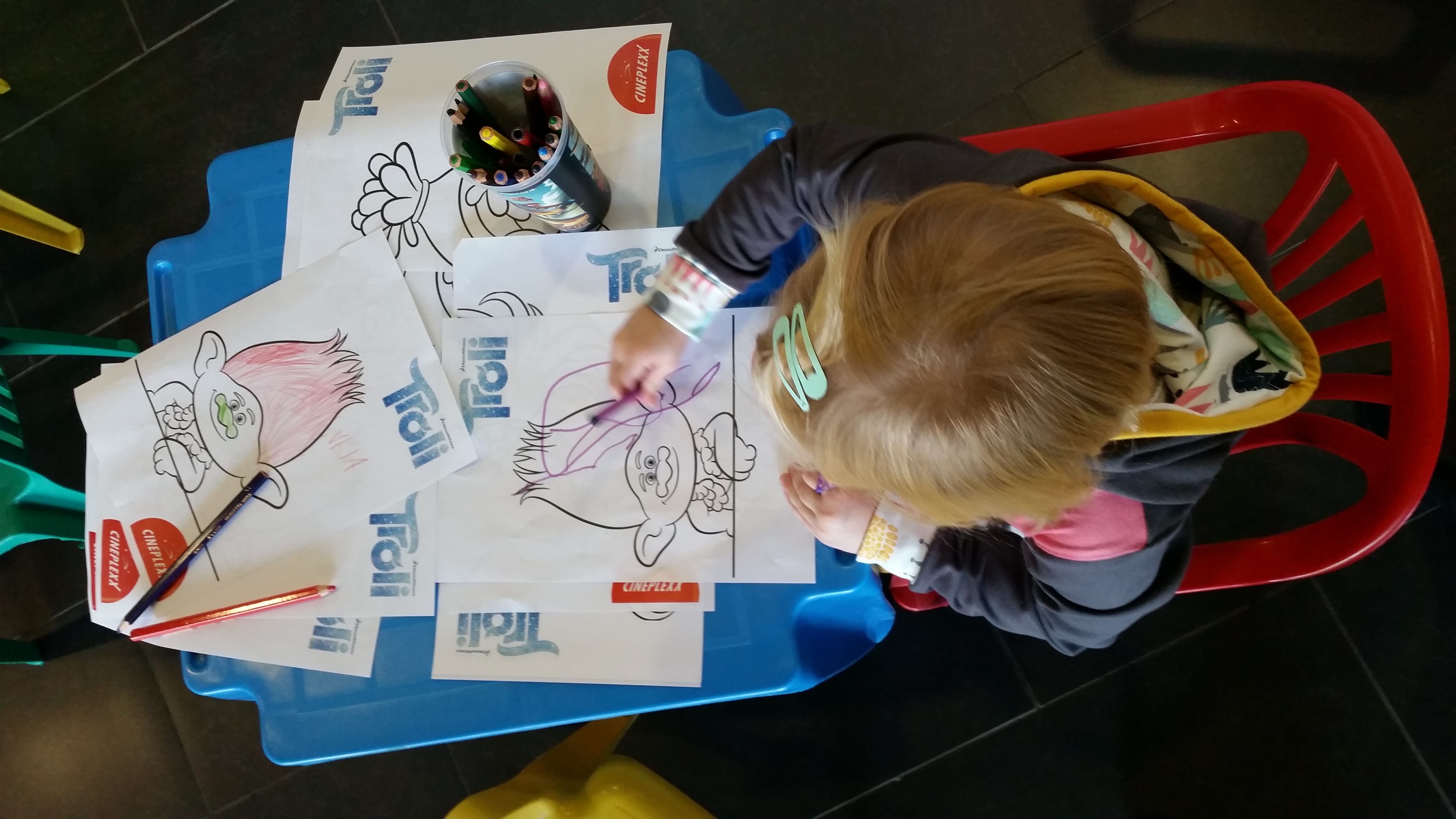 Najprej mazanje obraza; moja mala gospodična Ria se je spremenila v čisto pravo Poppy, barvanje pobarvank s Troli, pa vstopnice, igrala in klepetanje na zofah, nato stranišče (pred kinom greva vedno obvezno na stranišče), kokice s Troli, izbrala si je Poppy, balon in kino! Film je res zelo luštkan. Na začetku jo je bilo sicer strah Bergnov in je trikrat rekla, če greva, a si je vsakič znova, ko jo je prevzelo plesanje, petje in objemanje Trolov, premislila. Film je res zelo lep, pisan, živahen, dobra glasba, zabaven, dinamičen in Trolčki so super sladki. Prav spomnili so me na steklene Trole, ki sva jih s sestro zbirali kot otroka. Najbolj posebne jih naredijo lasje. Ob vodi, kokicah in čokoladi, sva film pogledali do konca in spet odšli domov navdušeni.