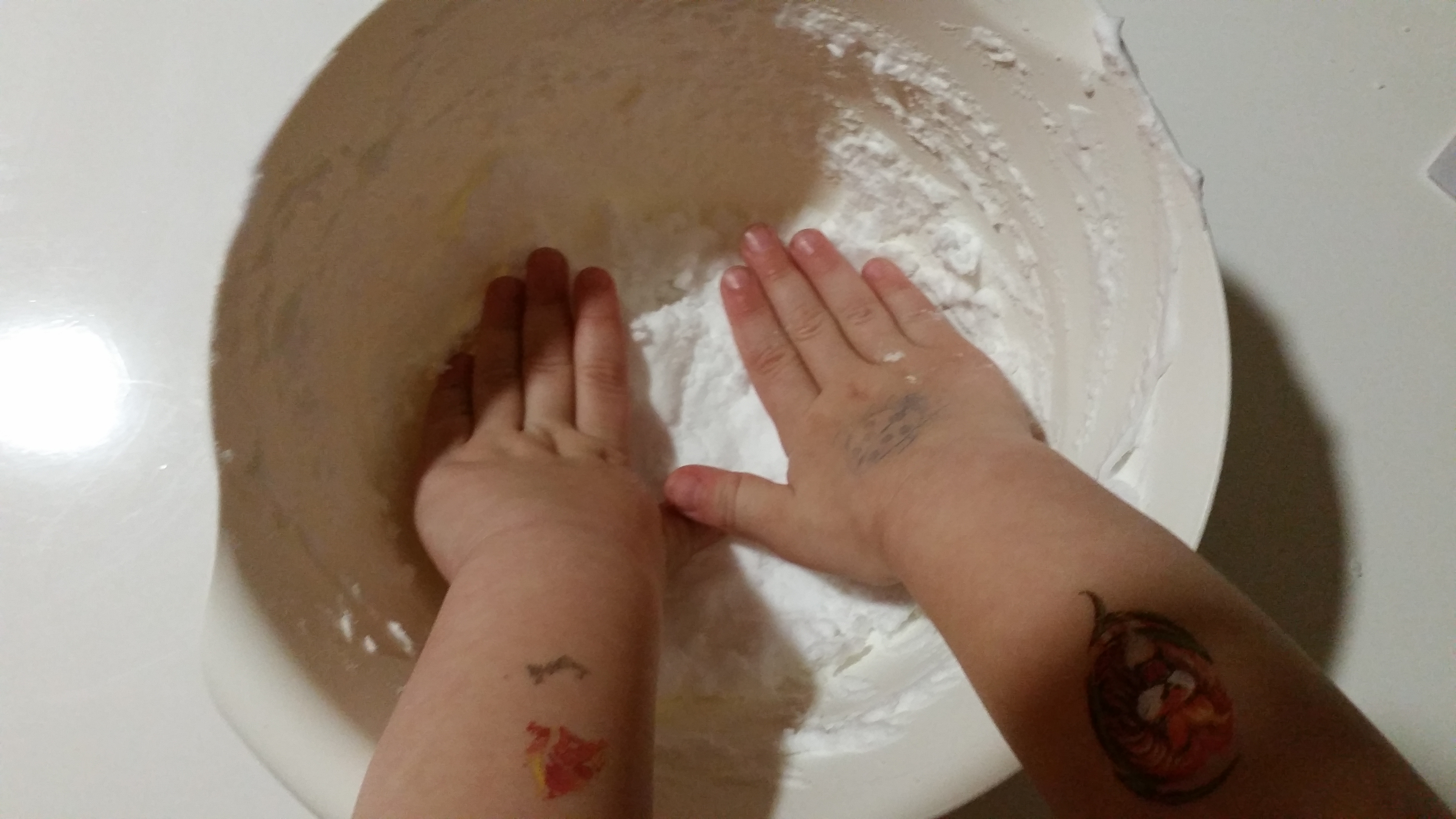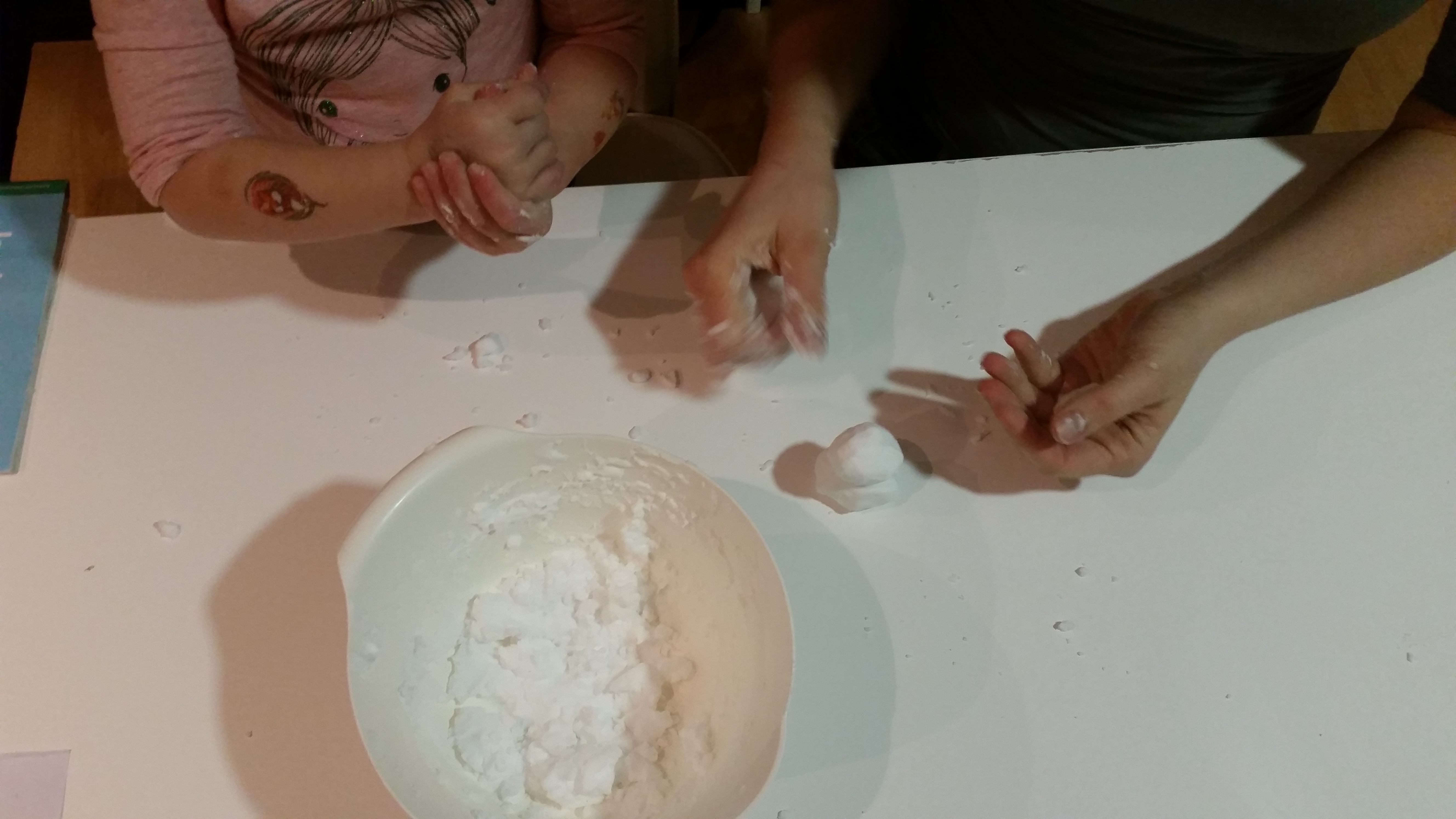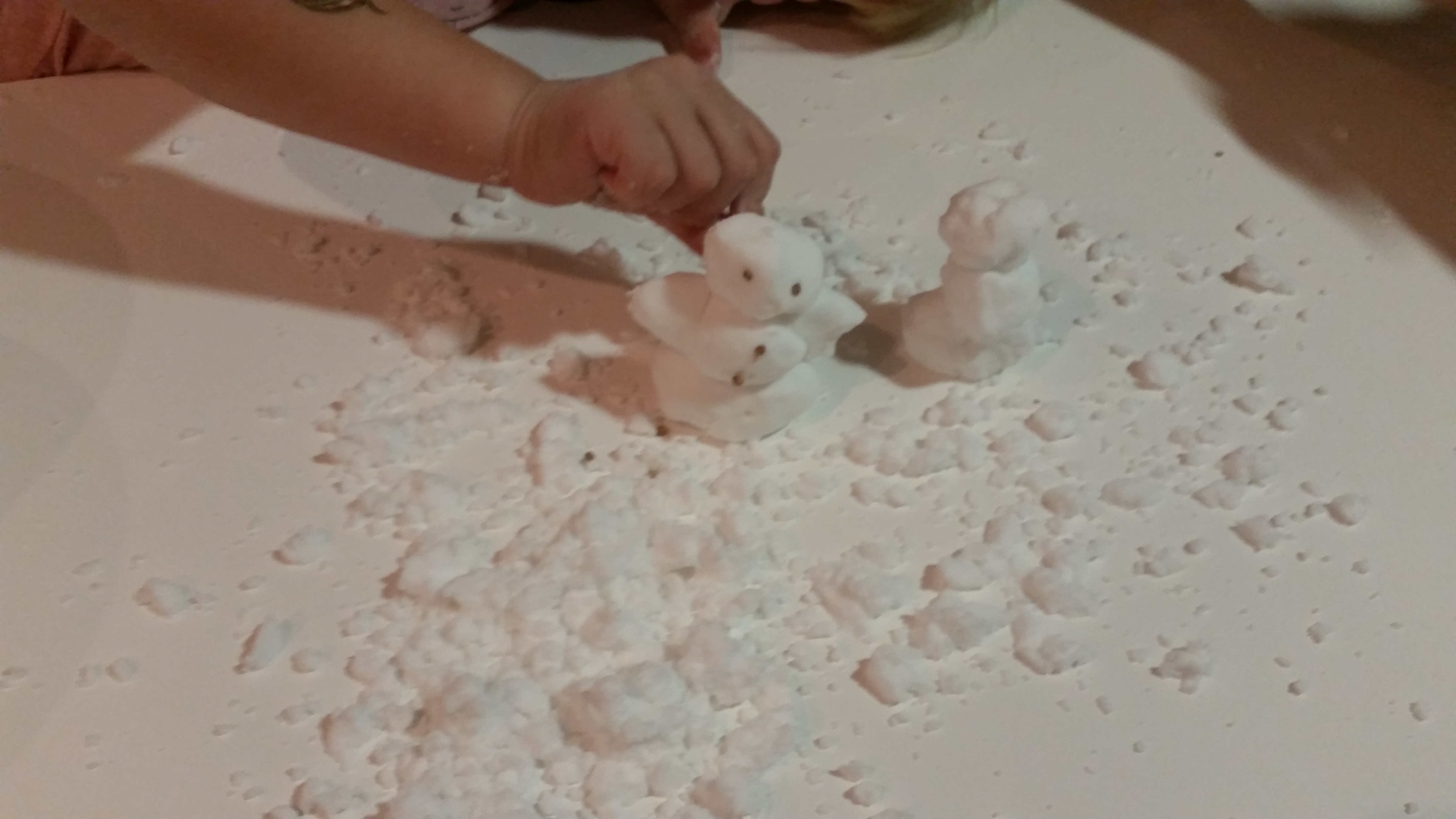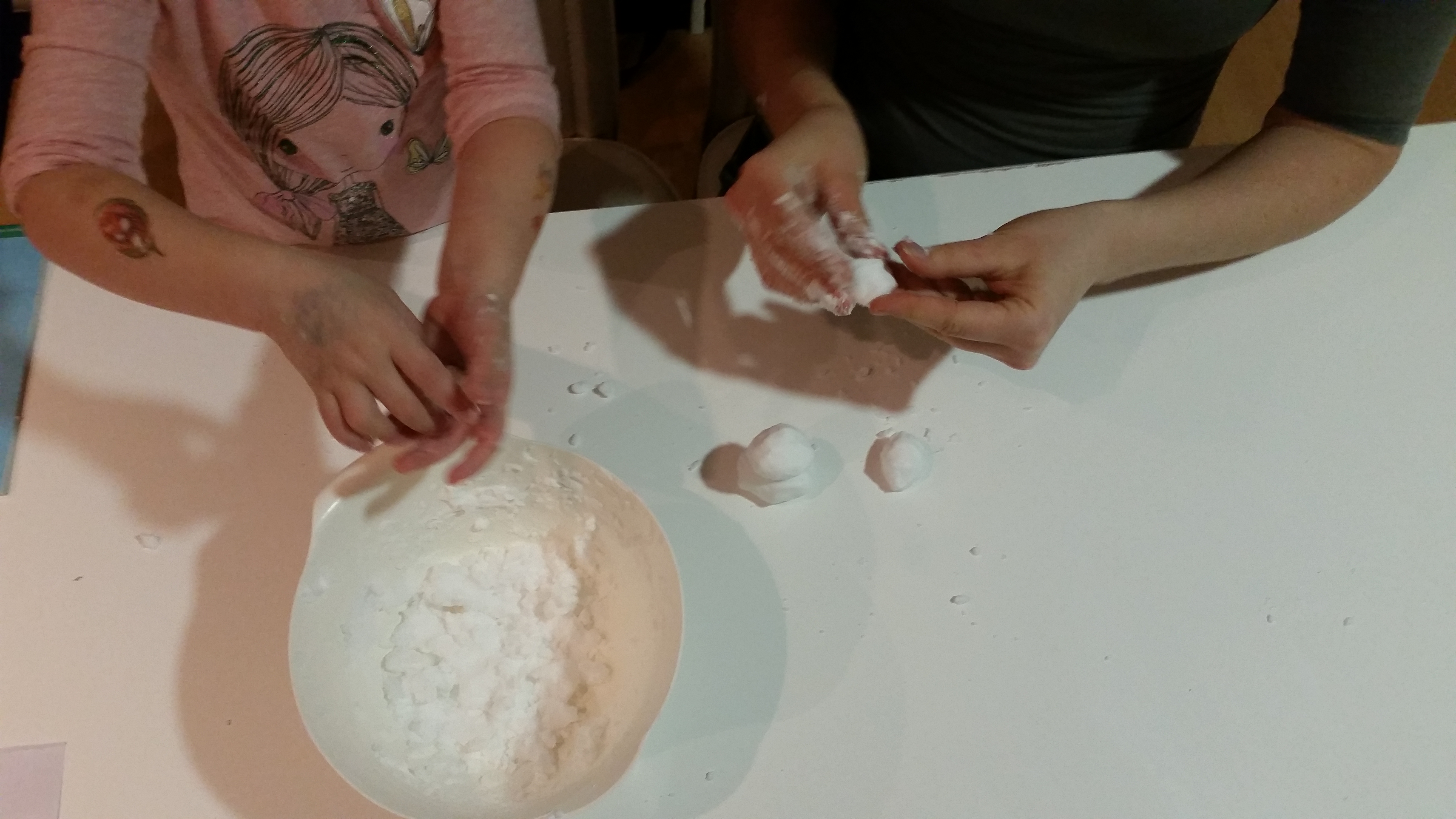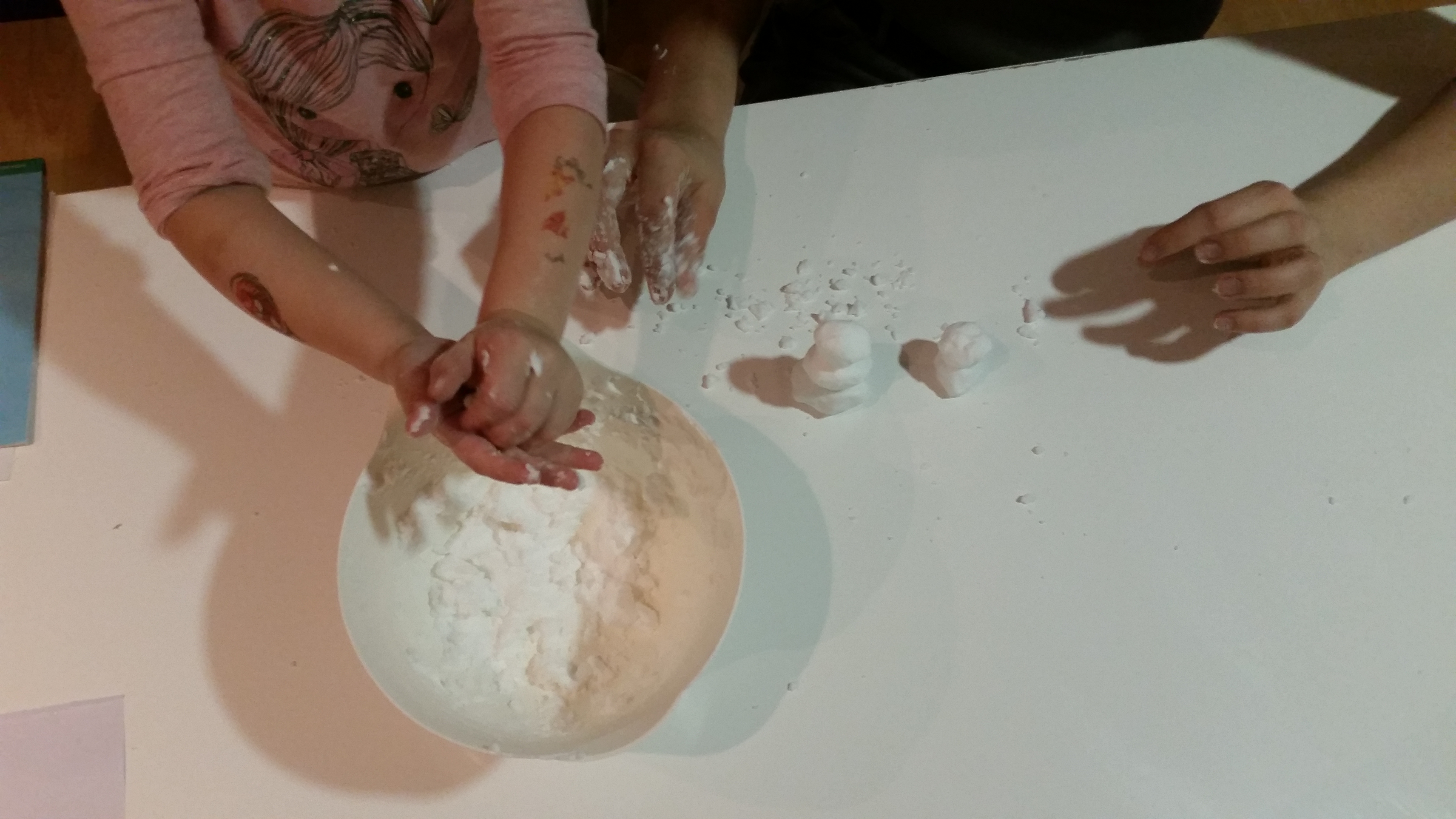 Zmes sicer ni povsem naravna, je pa super enostavna za narediti in res se lepo oblikuje. Midve sva iz nje naredili dva snežaka; sicer brez detajlov, ker se nisva ravno najbolje pripravili, potem pa sva naredili še snežno nevihto. Sploh si nisem predstavljala, da bo izpadla tako super masa. Nekaj sva je seveda imeli tudi po stolu in po tleh, pa nič za to. Sčisti se zelo enostavno. Shranili sva jo v posodo in tako zdaj čaka na nov sneženi dan.