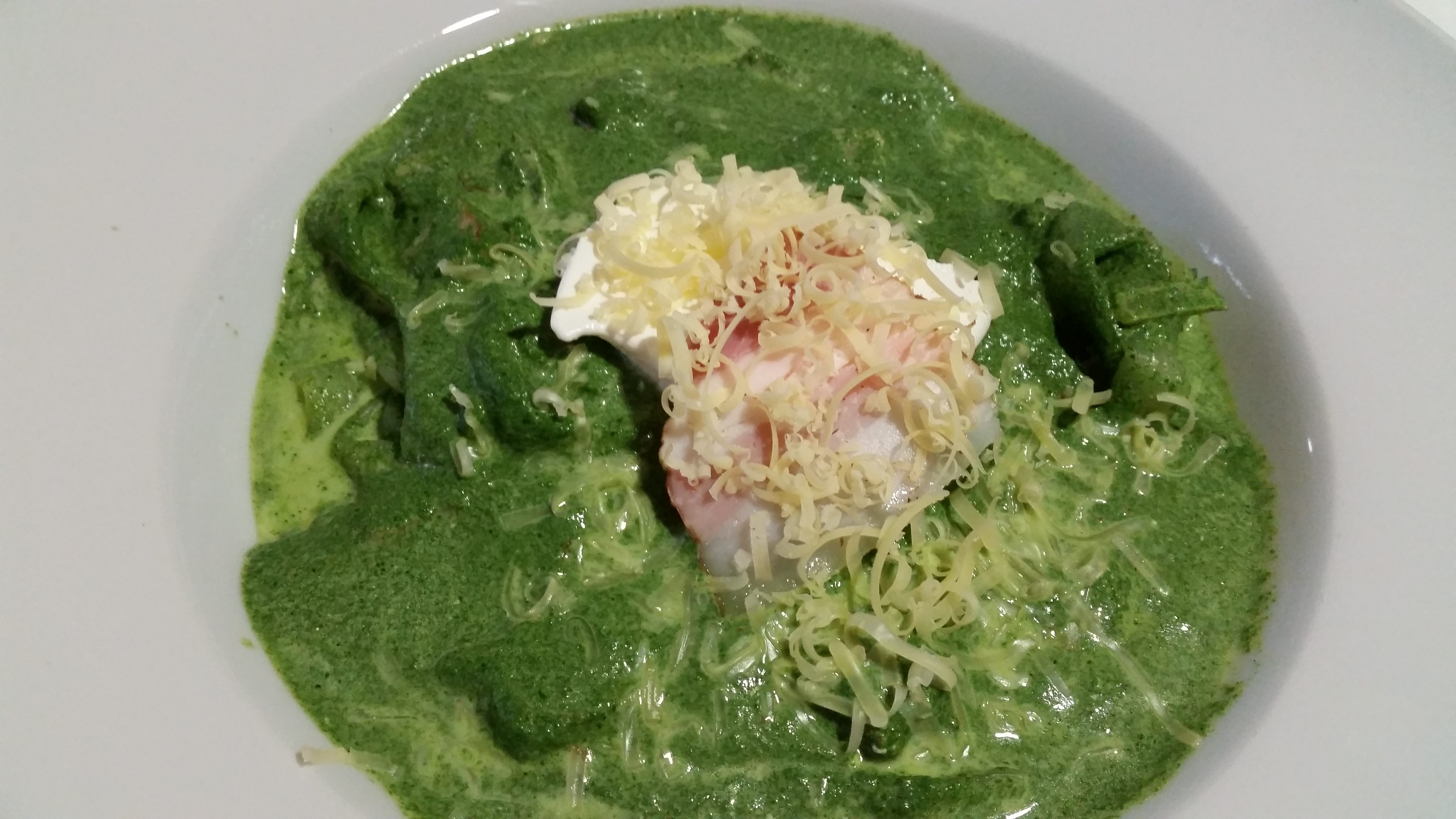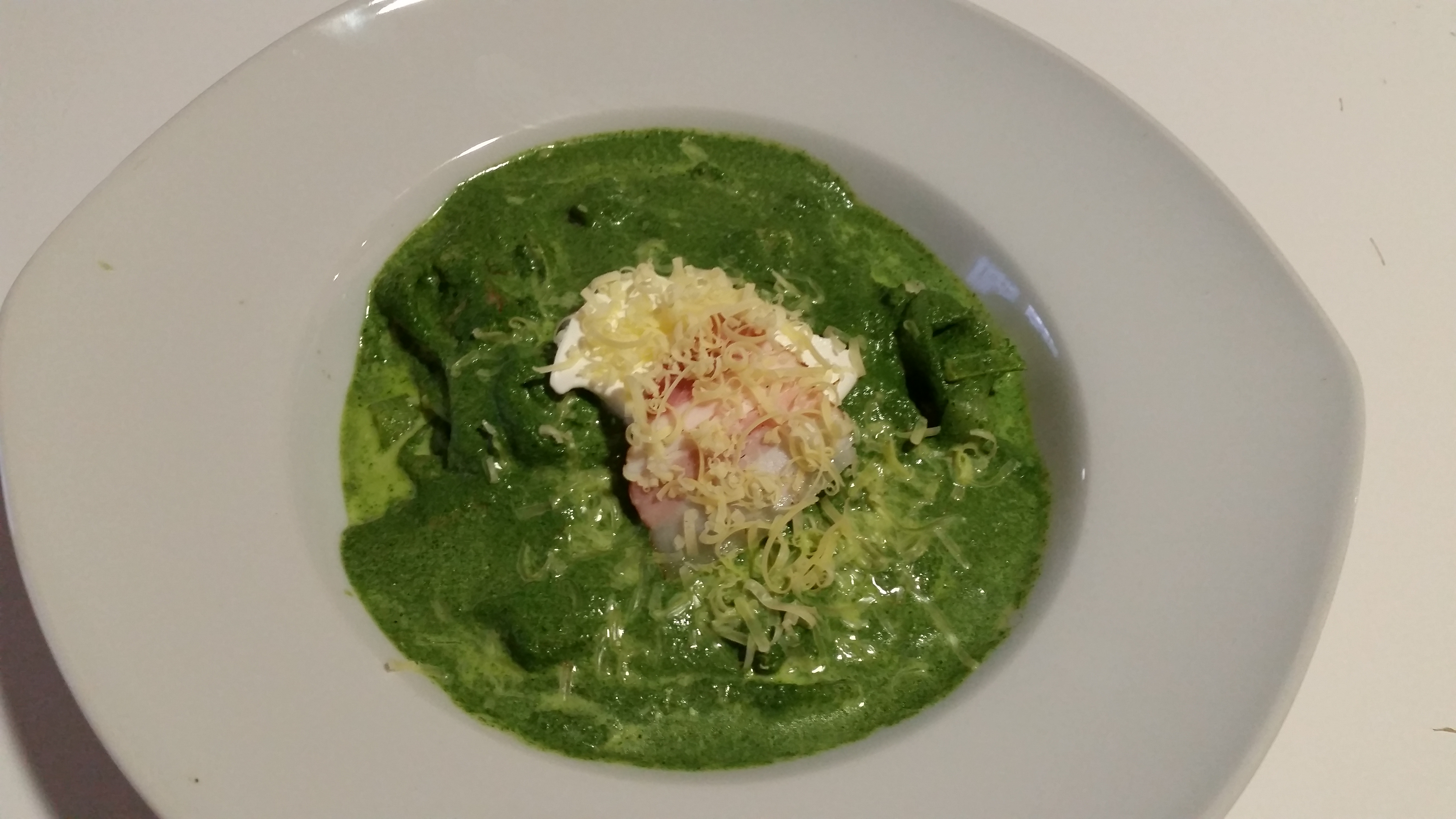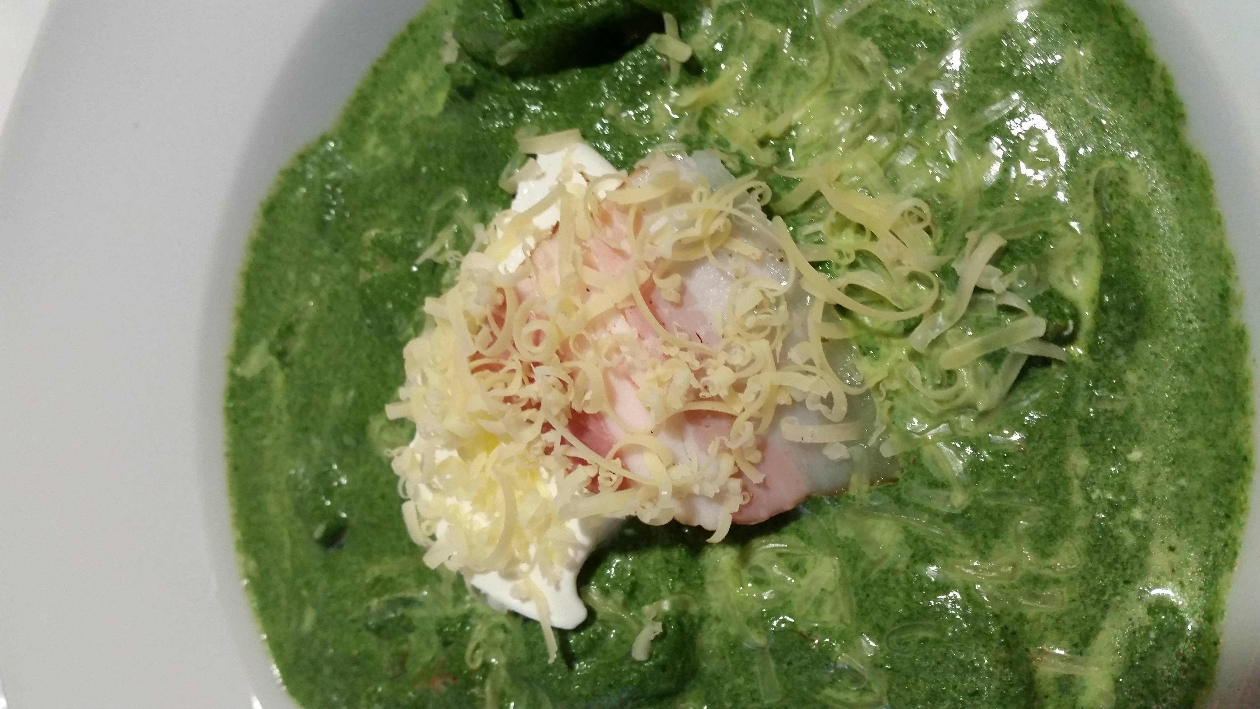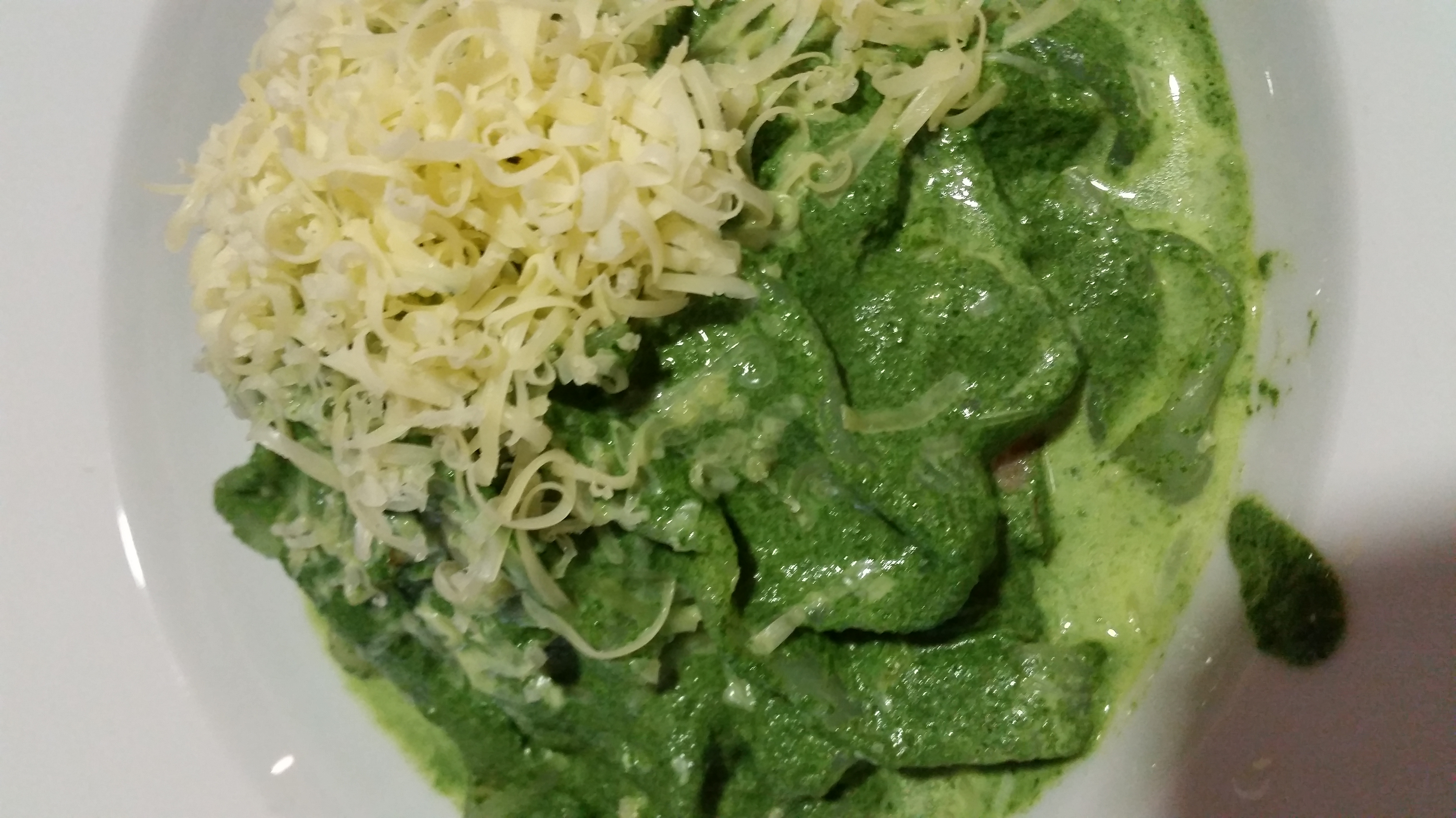 Čebula drobno nasekljamo in prepražimo na maslu, dodamo na koščke narezano slanino (hamburško ali panceto ali karkoli podobnega) ter pražimo, da slanina rahlo porjavi in postane hrustljava. Čudežne rezance speremo pod hladno vodo ter 3 minute kuhamo v vreli vodi. K slanini dodamo špinačo, ščepec naribanega muškatnega oreščka, sol in poper ter 1 strok česna. Prilijemo smetano za kuhanje in dodamo kislo smetano. Dobro premešamo in 2-3 minute kuhamo. Nato odcedimo rezance in jih dodamo v omako, dobro premešamo in e 2-3 minute kuhamo, da se rezanci malce pokuhajo v omaki. Odstavimo in pustimo stati 5 minut, da se rezanci navzamejo okusa in vsrkajo omako.