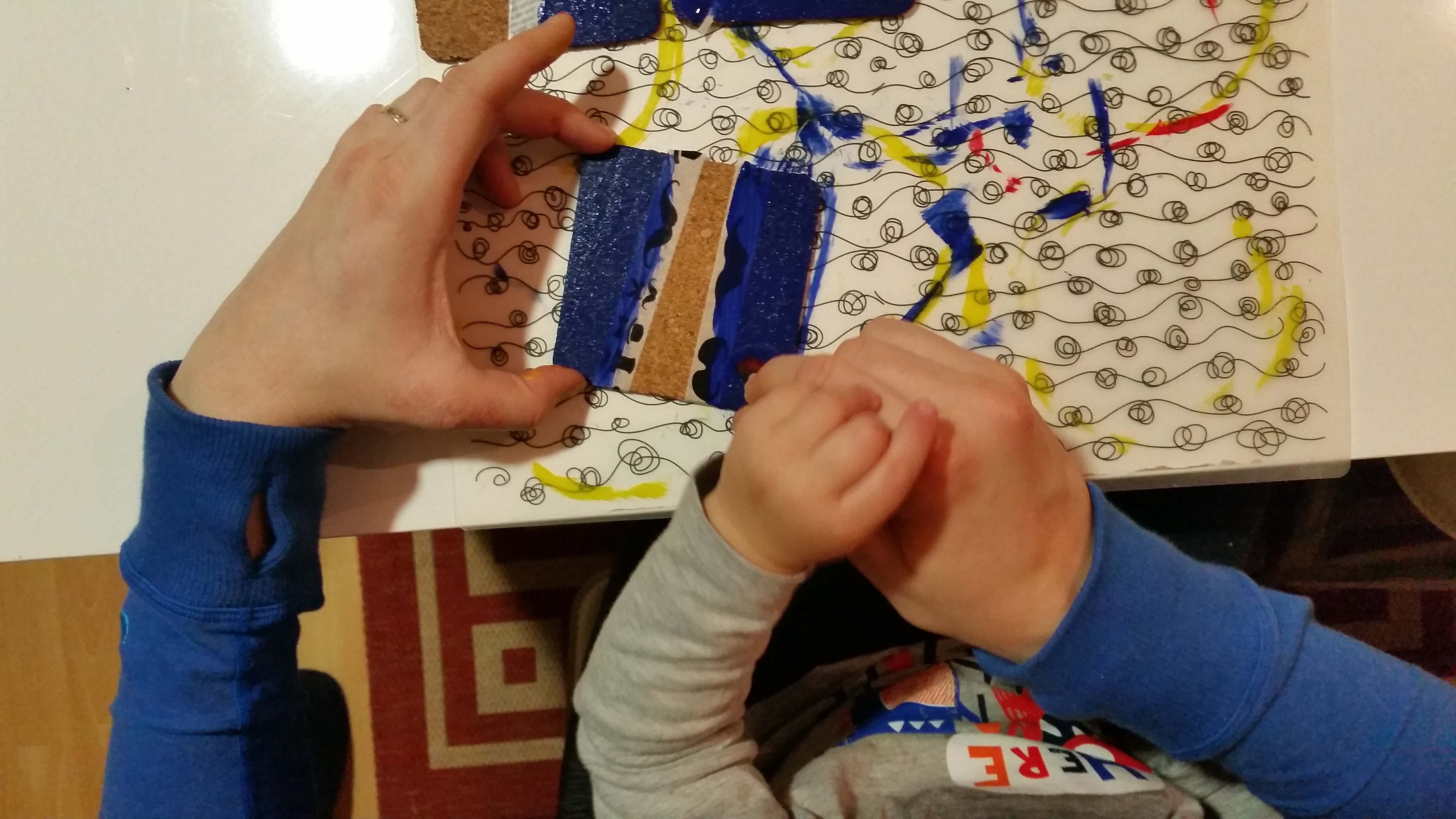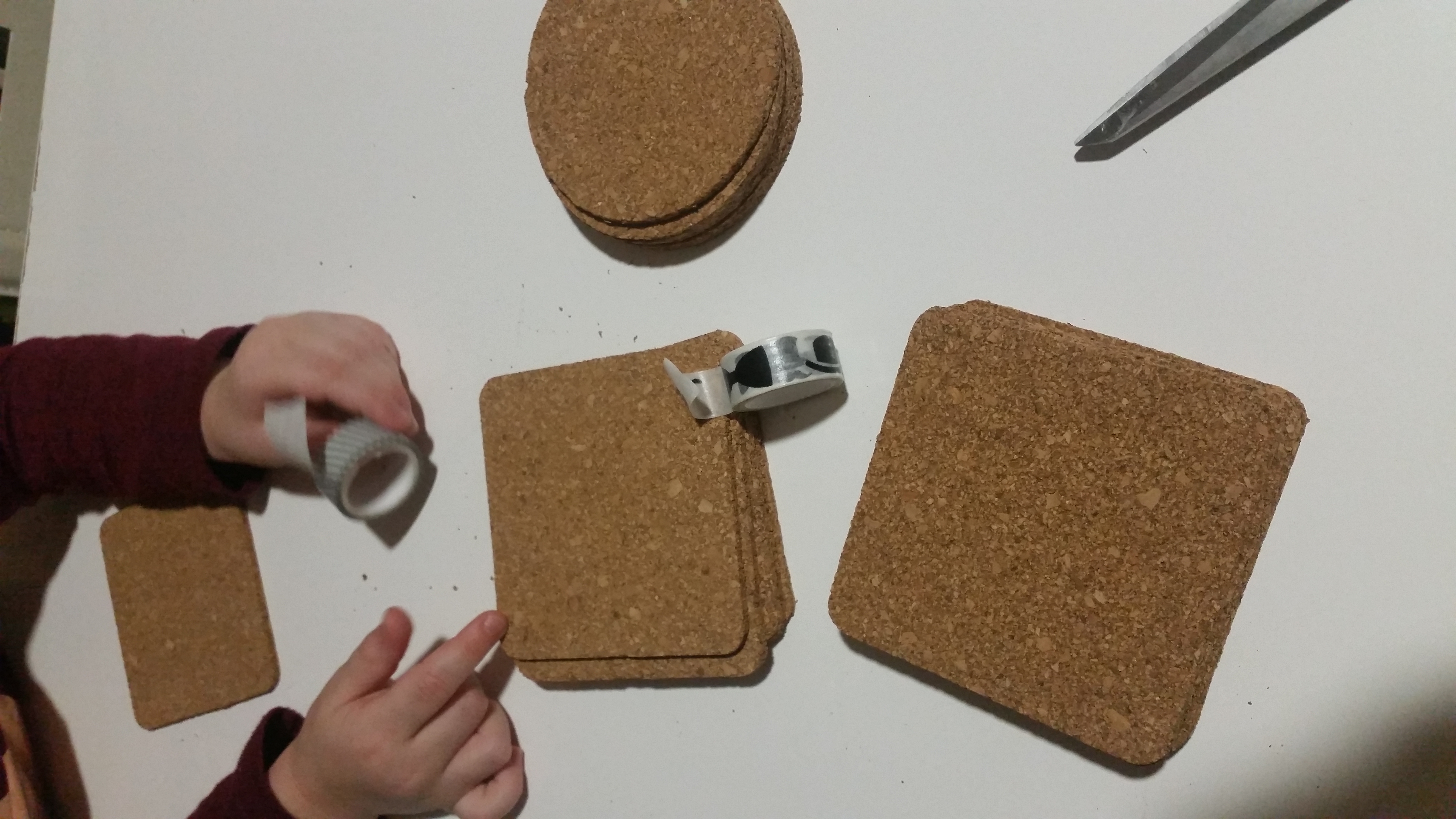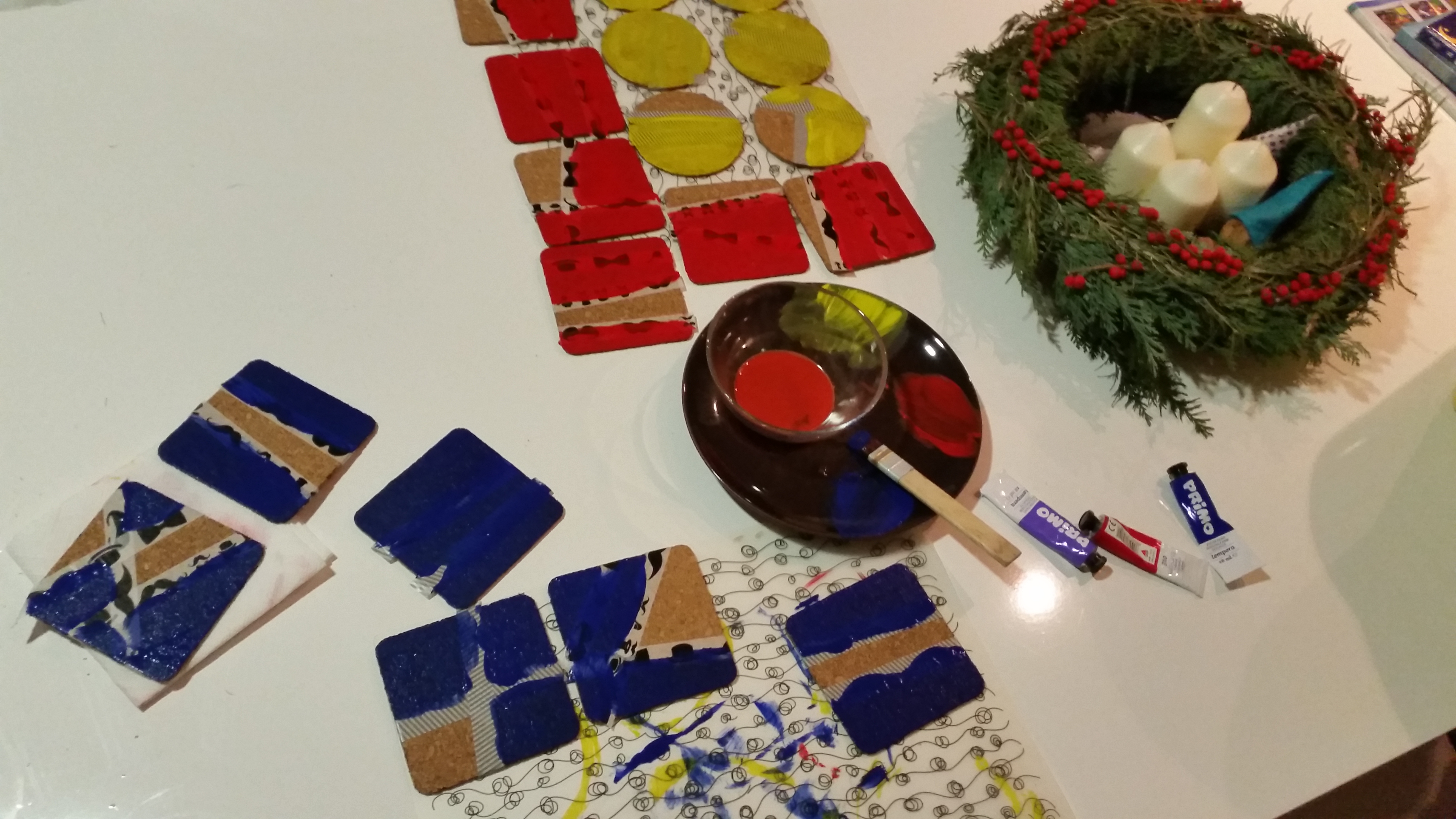 Odločili smo se, da bomo letos prav vsa darila oziroma večji del ustvarili sami, še posebje tista luštna, prikupna, ki jih podarimo sorodnikom in prijateljem. Zato smo se odločili, da ustvarimo podstavke z geometrijskim vzorcem. tokrat smo barvali z barvami po izbiri otrok; v drugi rundi pa jih bomo pobarvali s črno in belo. Ti so razigrani, tisti bodo elegantni. Podstavke je res luštno ustvarjati. Otroci ućivajo prav pri vseh opravilih in predvsem lepljenje je bilo noro zabavno zaradi rezanja s škarjami.