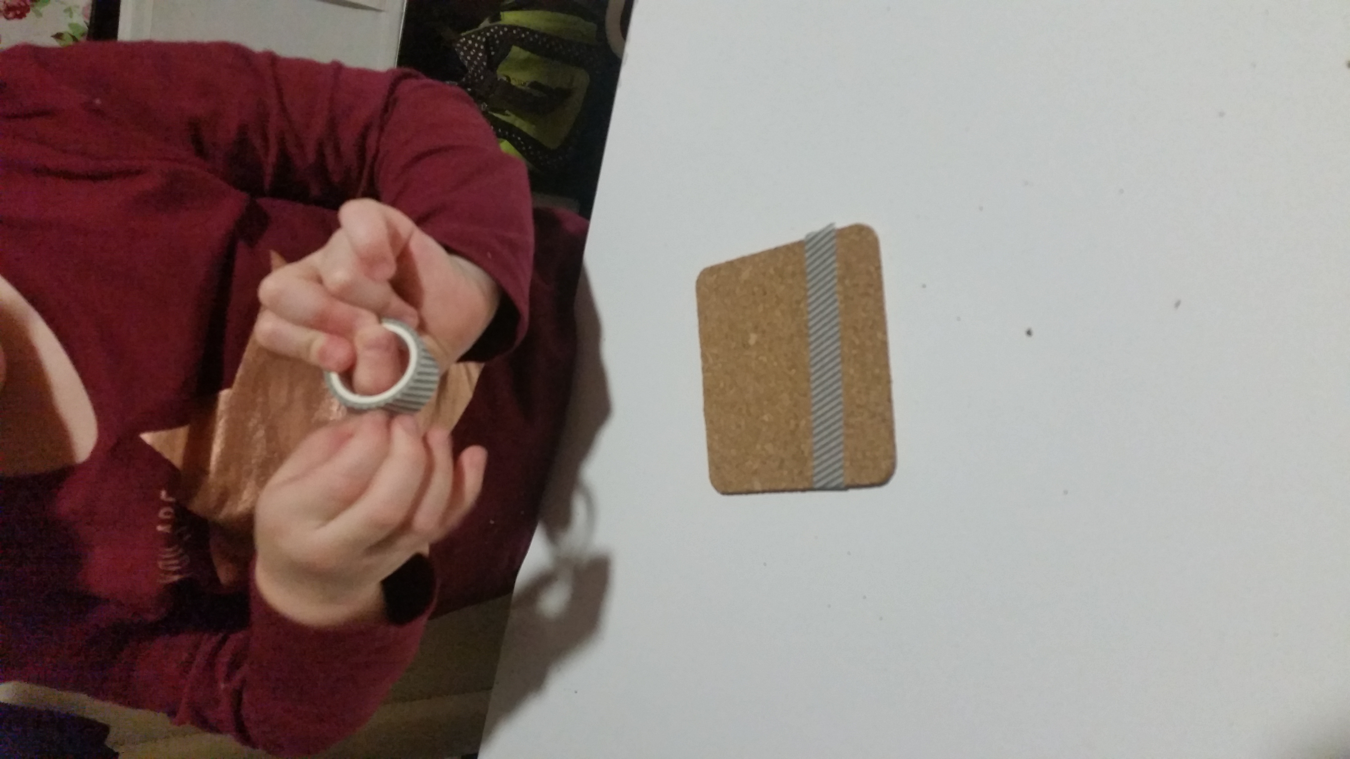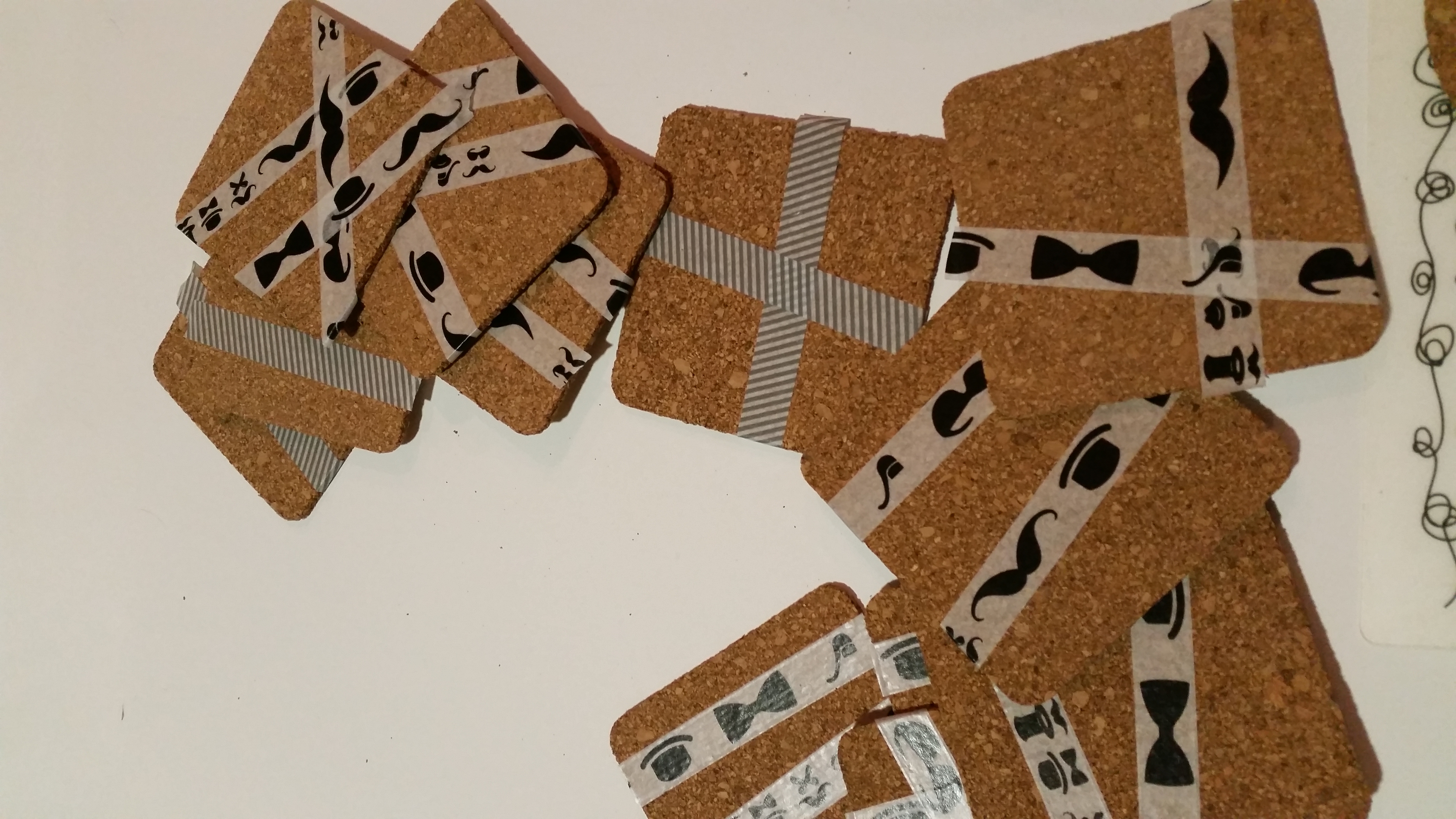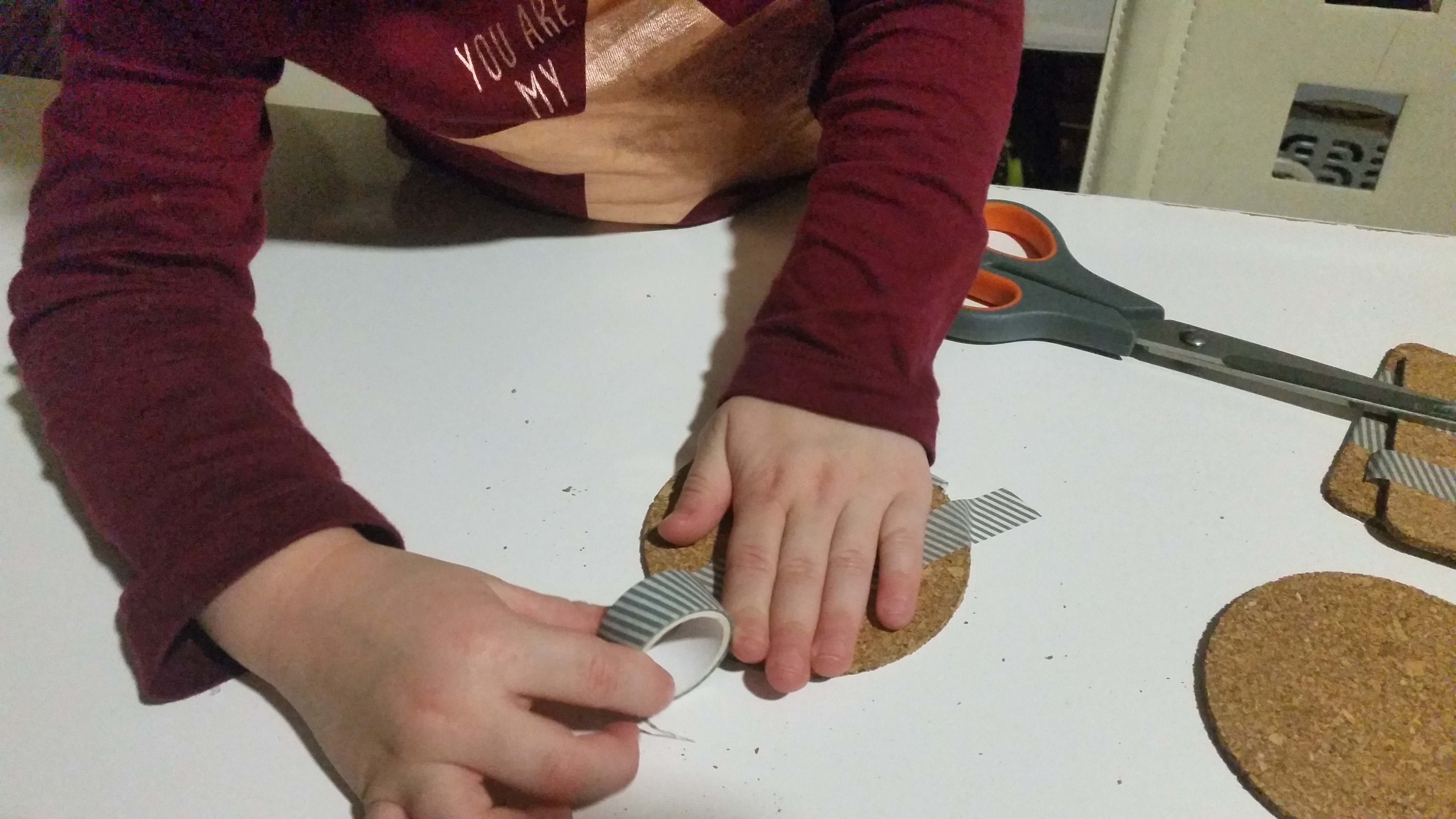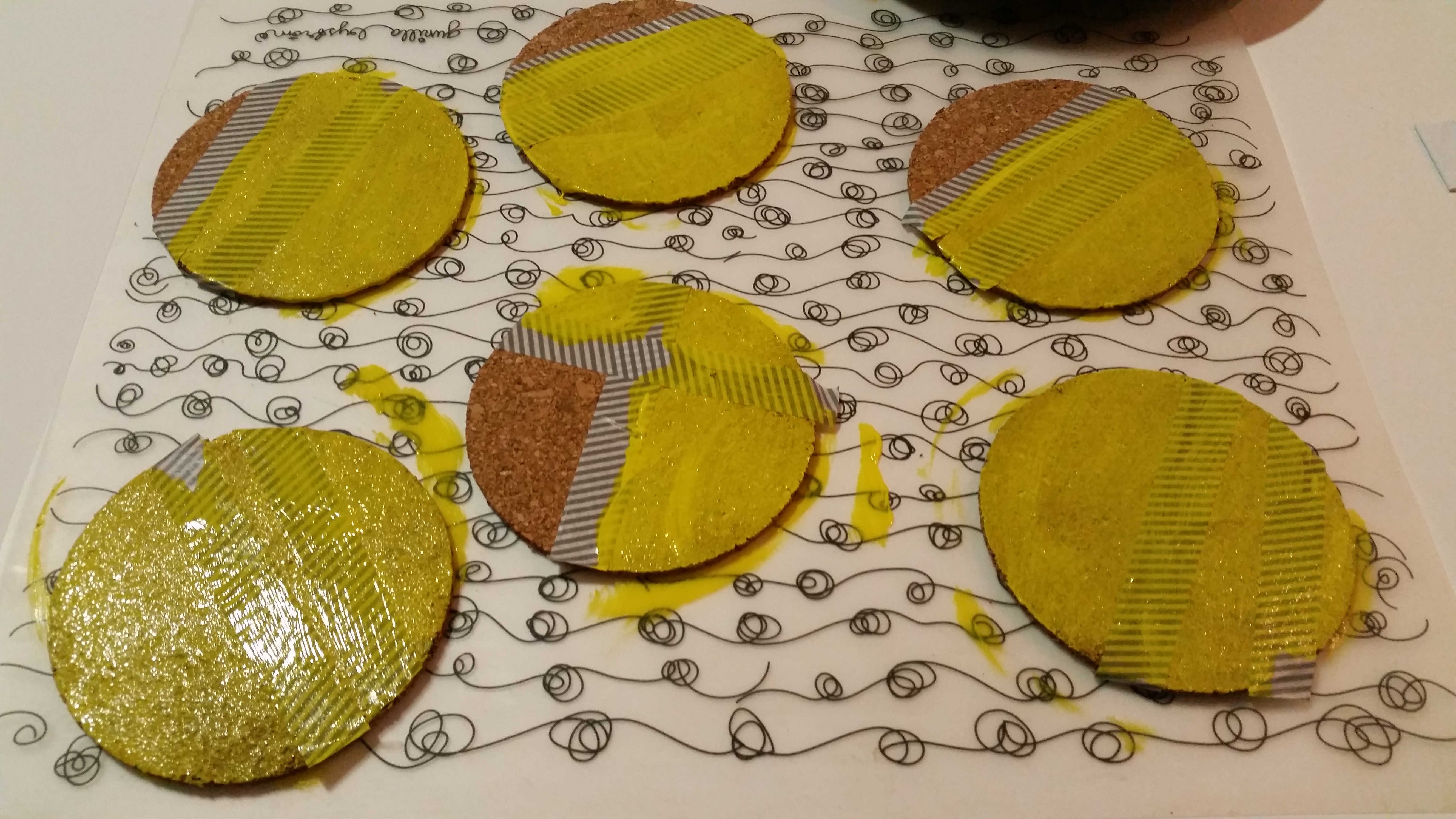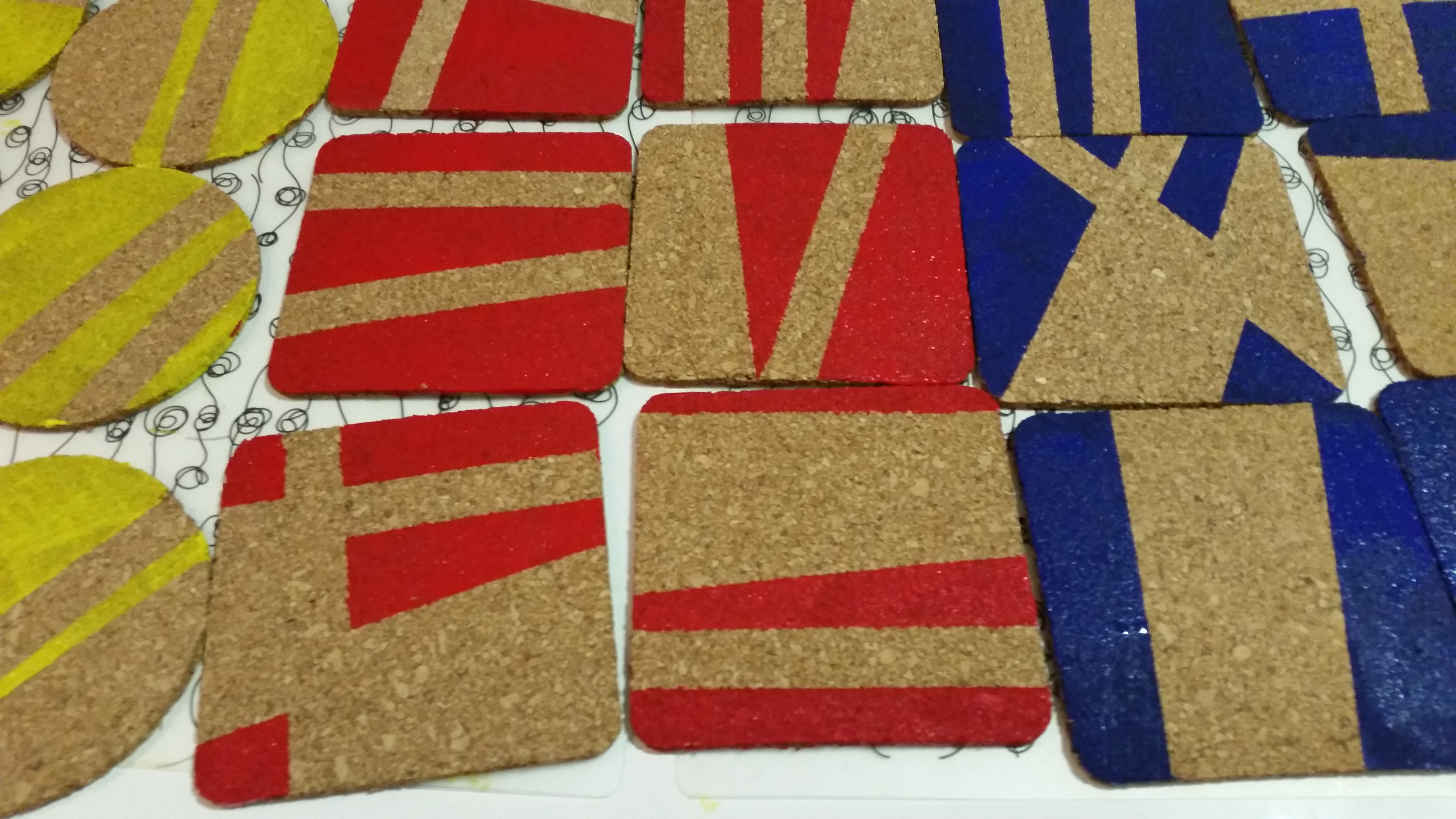 Podstavke poljubno prelepite z lepilnim trakom; ne pozabite, da tisto, kar bo prelepljeno s trakom ne bo pobarvano. Midve sva za vsak podstavek uporabili dva ali tri trakove in usvarili najrazličnejše vzorce. Potem podstavke poljubno pobarvate z barvami; lahko pobarvate vse neprelepljene dele podstavka, ali pa samo nekatere, naj se otroci igrajo. Nato pustite, da se podstavek posuši in ko je suh, snamete lepilne trakove. Nastanejo čudoviti vzorčki in res lepo unikatni darilo. Priporočam, da za barvanje uporabite bolj močne in temne barve ali pa svetle barve nanesete v več slojih, da bodo res lepo vidne.