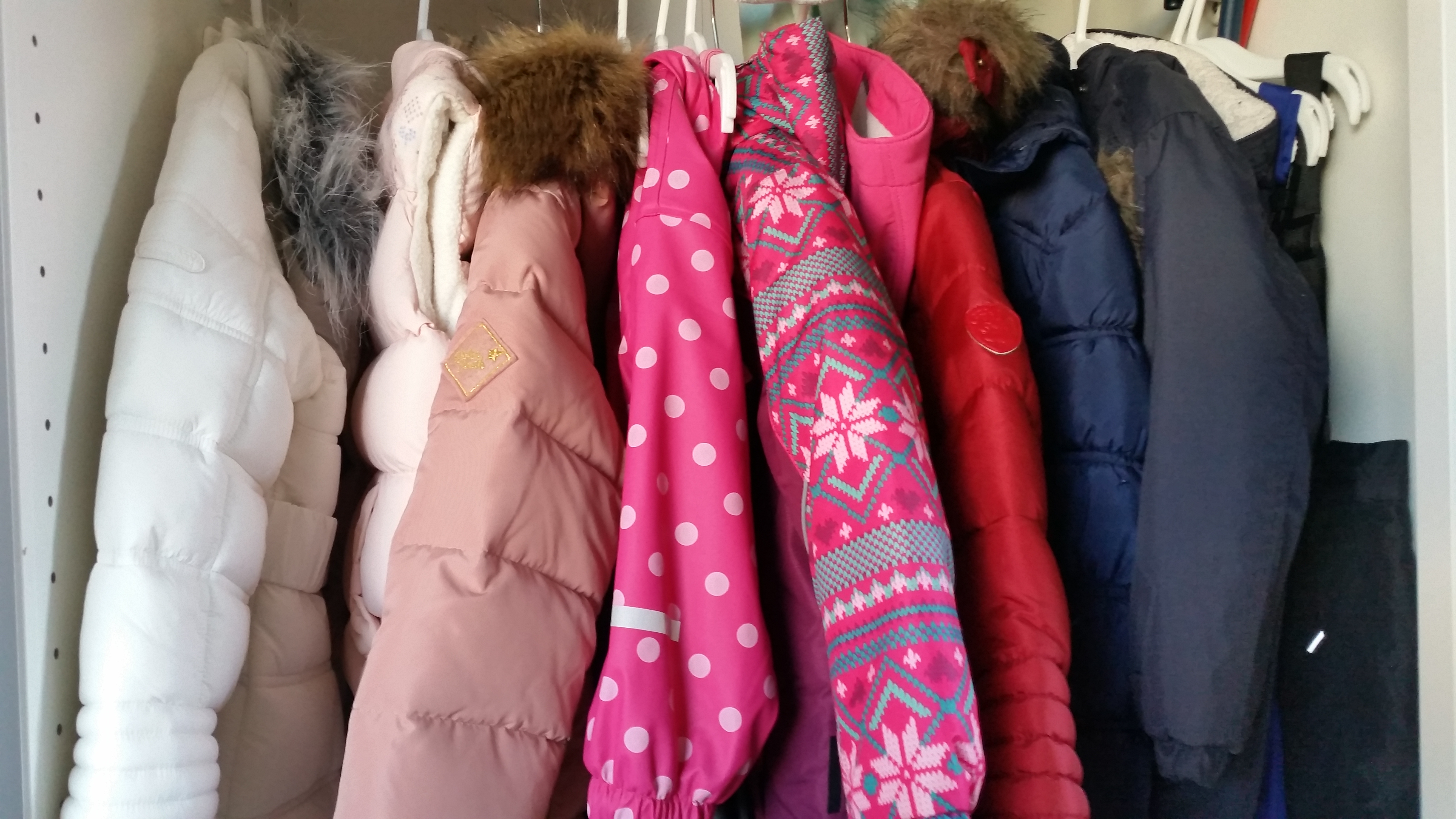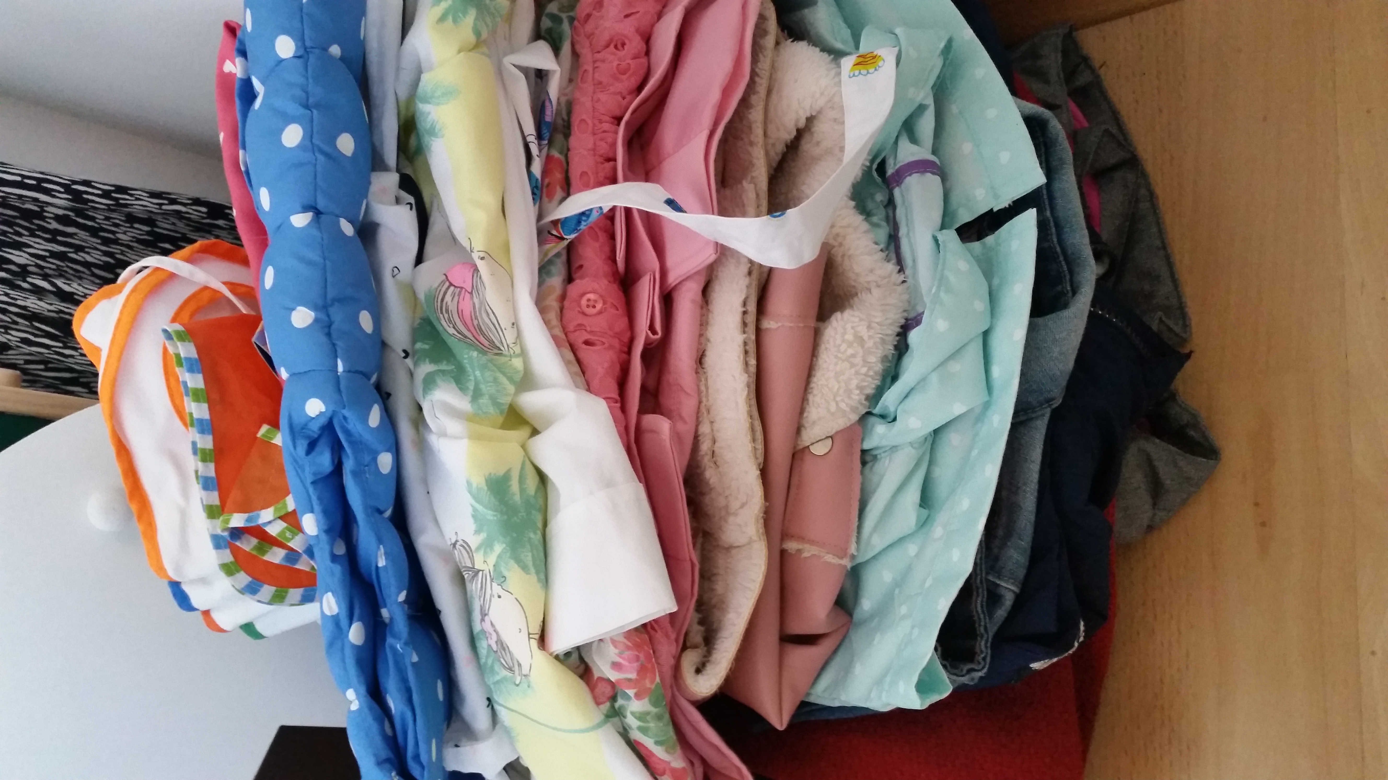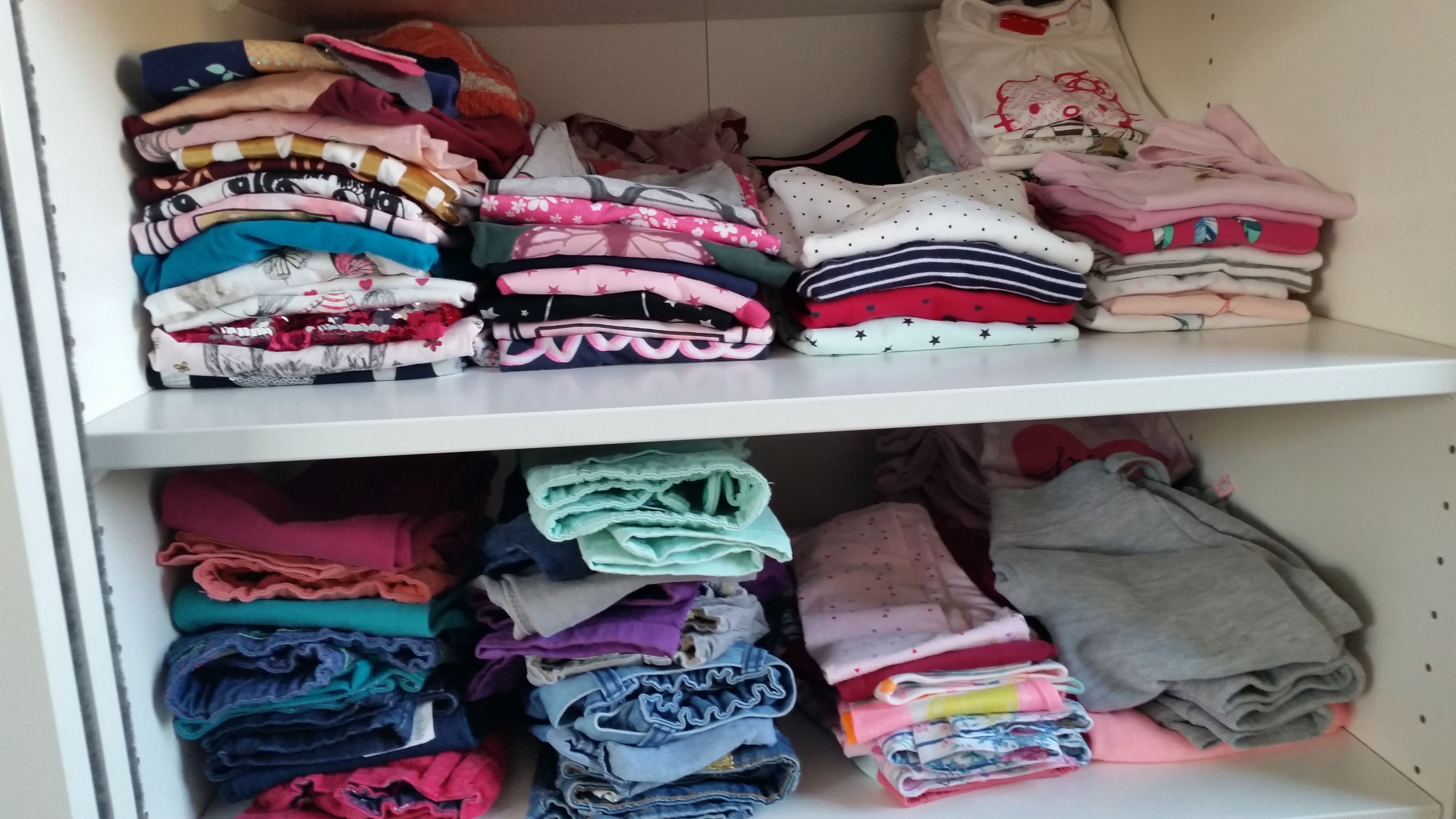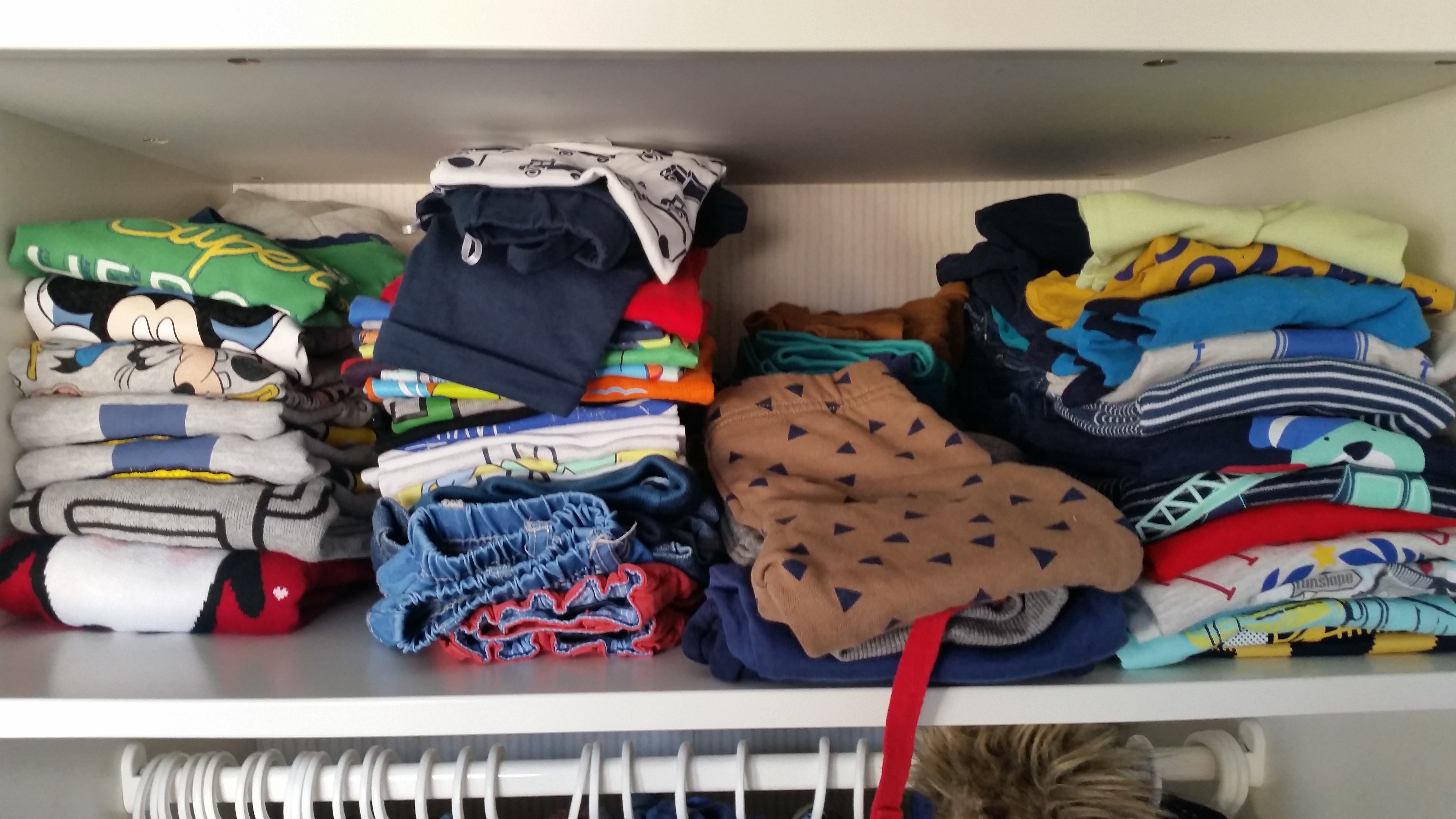 Takoj, ko se oblačila nakopičijo, pa postane težava sortiranje, organiziranje in pospravljanje. Ravno v ponedeljek sem izkoristila čas in sva z Noetom naredila red v obeh njunih omarah. Iz Riine je šlo ogromno kosov, ki so ji premali, vsi tisti moji najljubši iz pretekle sezone, ki jih je imela oblečene samo enkrat in so res nori. Zložila sem jih in jih bom shranila. Nekako se ne morem ločiti od njih, vsaj ne za takšno ceno, ot se večinoma prodajajo stvari na Facebooku in spletu. Seveda sva zložila tudi prazne obešalnike, mimogrede, H&M so meni top, najboljši, najlepši in zastonj – še kateri?, zaloga je ogromna, še za kakšno omaro in čakajo na nove kose, na razprodaje. Sicer pa imamo oblačila v omari sortirana na tista, ki visijo, ta so ločena na tri dele – en del so jakne in jopice, drugi so plaščki in bunde in tretji so bluzice, majčke, oblekice in tunike. Majčke, pulovrčke, kavbojke, pajkice, trenirke, kratke hlače, krila brez naramnic in ostale dorbne stvari pa imamo zložene na policah, medtem ko spodnje perilo, nogavice in hlačne nogavice hranimo v košaricah v predalniku. Pri Noetu je podobno, le da pri njem ni tako širokega spektra različnih kosov; hlače, majice, trenirke in puloverji so zloženi, srajčke, jopice, jakne, bundice, hlače na naramnice in plaščki pa visijo. Vse ostalo je v predalniku. In za lažji pregled je vse sortirano po barvah oziroma barvni lestvici.