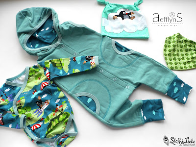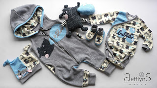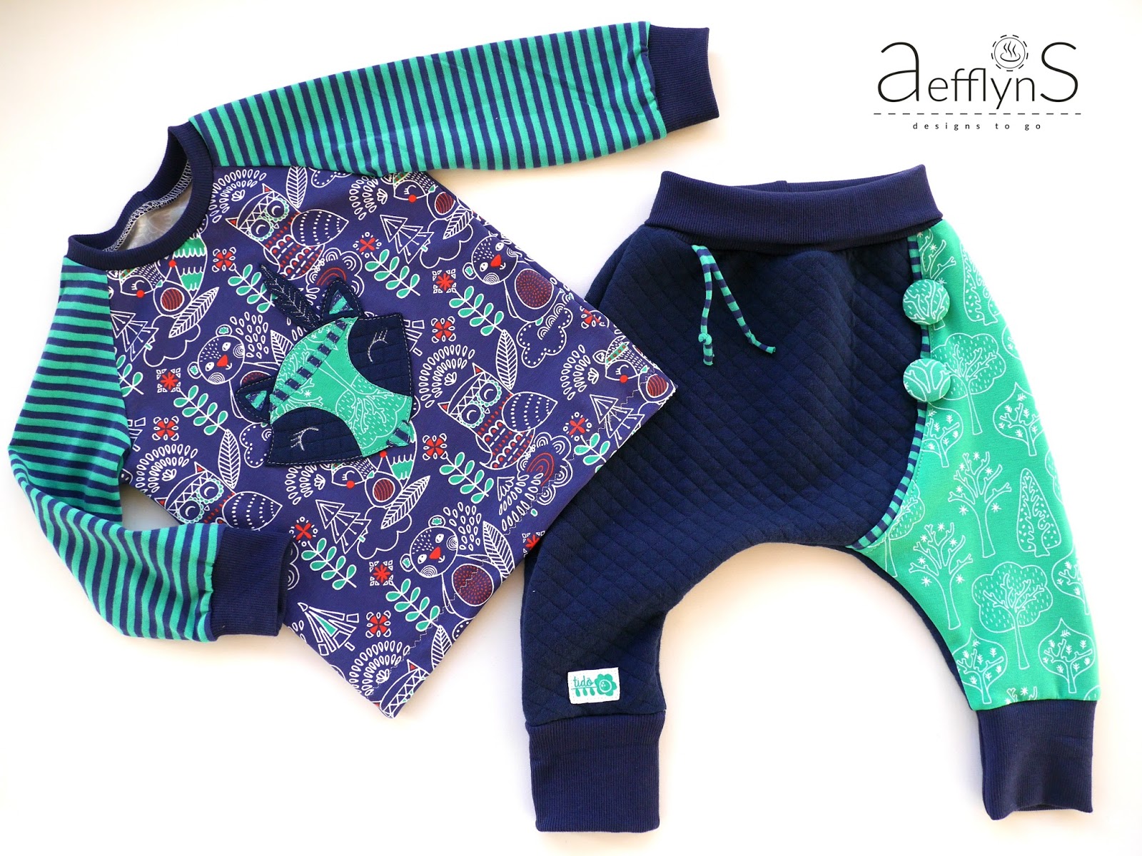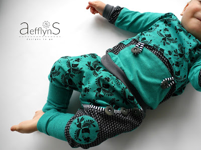 AefflynS – ustvarjalka je mama dveh dečkov, dojenčka in malčka in v glavnem šiva za svoja fantiča. Njene kreacije so vedno dodelane do podrobnosti in kar mi je še posebej všeč, ustvarja zgodbe; zašije cel komplet oblačil na isto temo – pajac, bodi, hlače, kapico, rutico, odejico in še kakšno mehko igračko zraven. Vsak izdelek je projekt in pri njej mi vedno padejo v oči domiselni načini kombiniranja blaga; prekrasni prehodi, šivi, nenavadni rezi in oblike ter detajli, ki vse skupaj povežejo v celoto. Na njeni spletni strani najdete tudi nekaj tutorialov, vzorcev, brezplačnih krojev oziroma `freebooks`, nasvete, povezave in še veliko vsega.