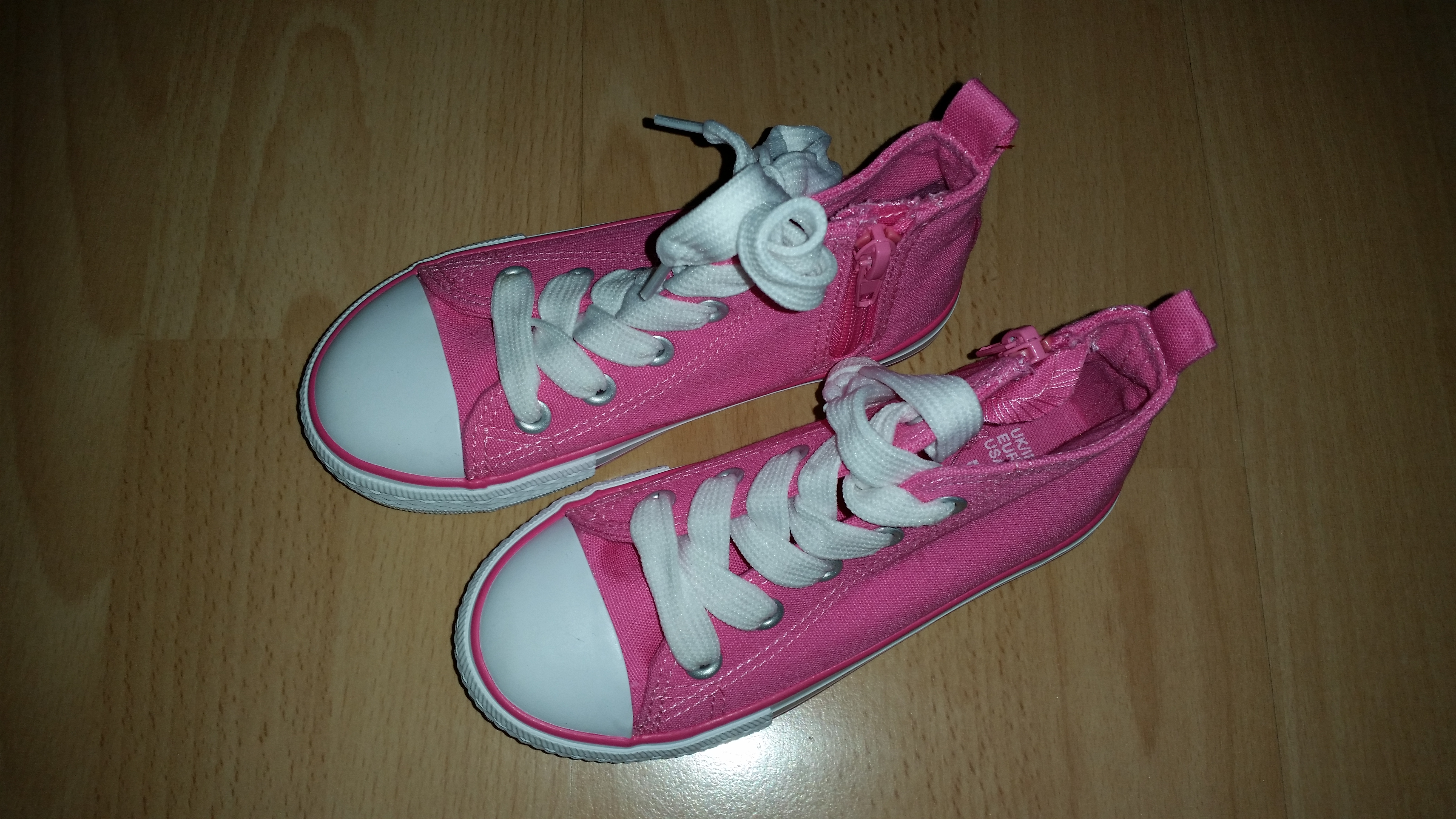 Najmanj znižanega je vsekakor na otroškem oddelku, pa še to so pri dojenčkih v glavnem dekliške stvari v velikosti 0-3 oziroma 3-6 mesecev, pri dečkih pa je znižanih le nekaj kosov. Pri večjih deklicah se najde nekaj oblekic, majčk s tričtr rokavi, jopic in tudi jakna iz umetnega krzna, ki je meni osebno grozna in je tudi za zgolj par evrov ne kupim. Sem ji pa, čeprav obutve v Primarku ne kupujem, sploh ne otroške, kupila platnene teniske v stilu `Allstark`, ker so stali smao 3 evre.