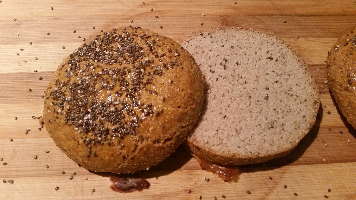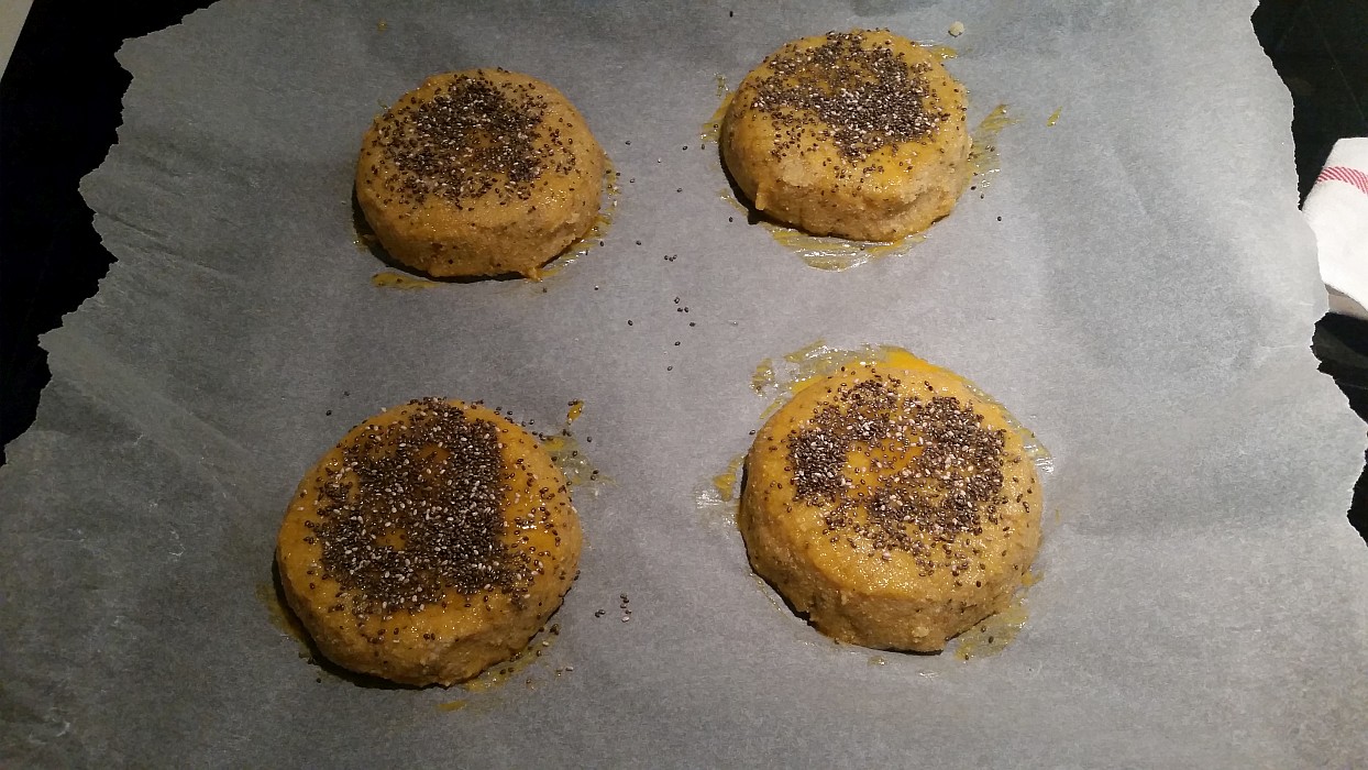 Beljake stepite v sneg. V drugi posodi zmešajte suhe sestavine in jim dodajte celo jajce ter dobro premešajte, nato prilijte vodo in ponovno do gladkega zmešajte ter na koncu počasi vmešajte sneg iz beljakov. Nastane kompaktno, mehko in prijetno dišeče testo, ki ga ni potrebno mesiti. Razdelite ga na 4 enake dele in iz njega oblikujte kepice ter jih sploščite, da bodo debele približno 3-4 cm. Premažite jih z rumenjakom, ki mu primešate eno žlico vode ter posujte s chia semeni. Pecite jih na 180 stopinj približno 30 minut.