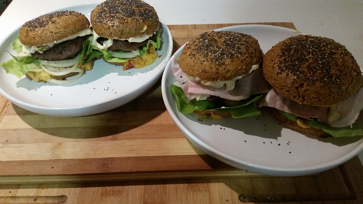 V burgerje sem dala: majonezo, gorčico, paradižnikovo omako, skuto, govejo pleskavico, kisle kumare, mehko solato, paradižnik, čebulo, slanino in sir. Ponavadi dodam še rezino avokada, a ga nismo imeli doma.