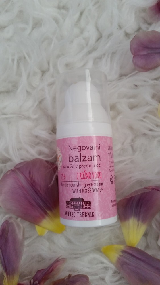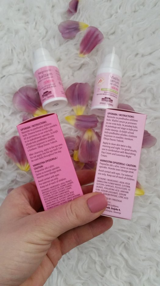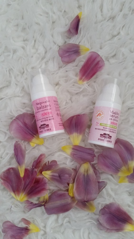 Nekaj tednov je že odkar sem prejela tri super izdelke znamke Dvorec Trebnik; vlažilni serum za obraz z rožno vodo, negovalni balzam za kožo v predelu oči z rožno vodo in anticelulitno olje za masažo. Serum in balzam sta že nekaj časa v uporabi, olje pa sem šele začela uporabljati, zato bom mnenje o njem še malce zadržala zase in vam ga zaupala čez nekaj tednov.