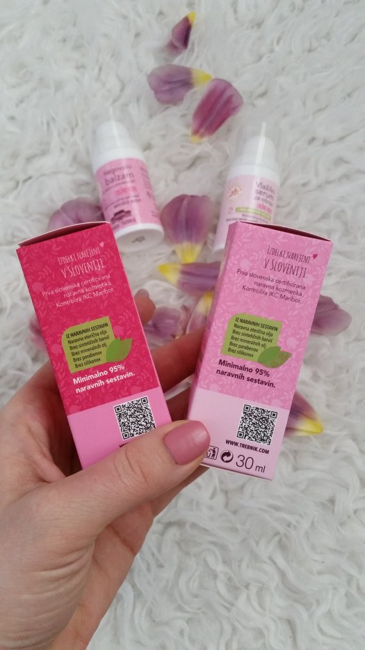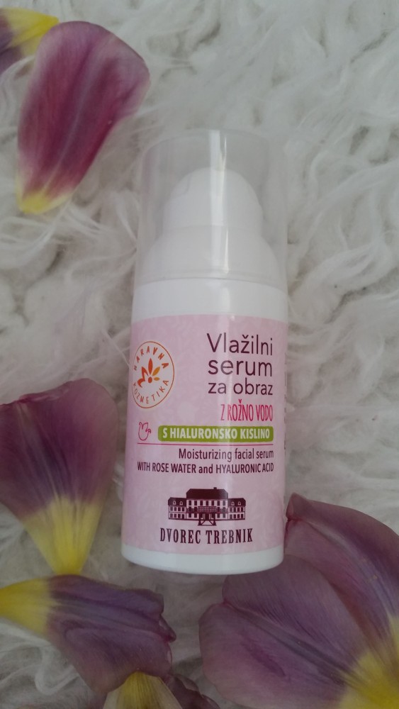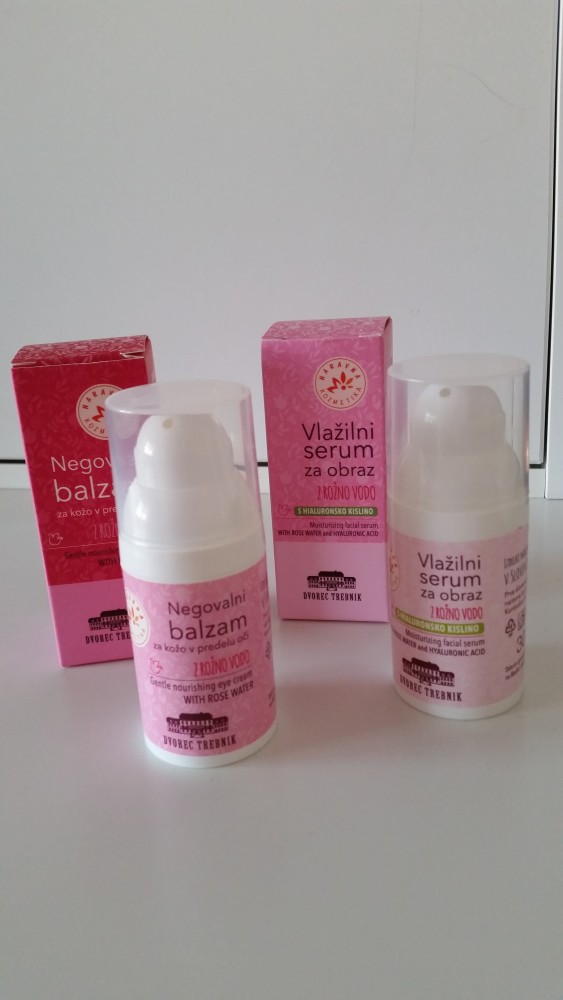 Dvorec Trebnik je znamka, ki jo poznam in uporabljam že dalj časa, še posebej všeč mi je njihov program s sivko, vendar pa se nikoli nisem odločila za izdelke za nego obraza, odkrito, v poplavi vseh teh reklam in izdelkov na njihove izdelke sploh nisem pomislila in prav zato sem jih bila še toliko bolj vesela. Končno priložnost, da preizkusim tudi to. Serum in balzam sem začela uporabljati istočasno in ju uporabljam že kakšne tri tedne in sem nad njima navdušena; vlažilni serum prijetno vlaži in osveži kožo in prav nikoli nimam občutka zategovanja, prav tako pa koža ni lepljiva (kot pri nekaterih drugih). Tekstura je ravno pravšnja za izdaten nanos in tako ga za cel obraz potrebujete le kakšno zrno, se lepo razmaže in zelo dobro vpija. Všeč mi je hladilen občutek takoj ob nanosu in zelo lepo se obnese pod ličili. Všeč mi je tudi vonj rožne vode, ki daje serumu dodatno svežino.