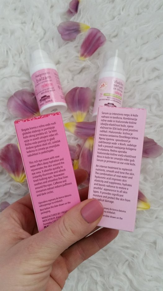 Pri obeh izdelkih pa me je povsem navdušila sestava, saj sta povsem naravna, vsebujeta namreč najmanj 95% naravnih sestavin, narejena sta iz naravnih eteričnih olij in ne vsebujeta sintetičnih barvil, mineralnih olij, parabenov in silikonov. Serum poleg tega vsebuje še hialuronsko kislino, ki izboljša elastičnost kože ter njeno vlažnost, balzam pa vsebuje izvlečke kofeina in cimeta, ki odpravljata zabuhlost in podočnjake, poleg tega pa oba vsebujeta rožno vodo, ki vlaži, pomlajuje in ščiti kožo.