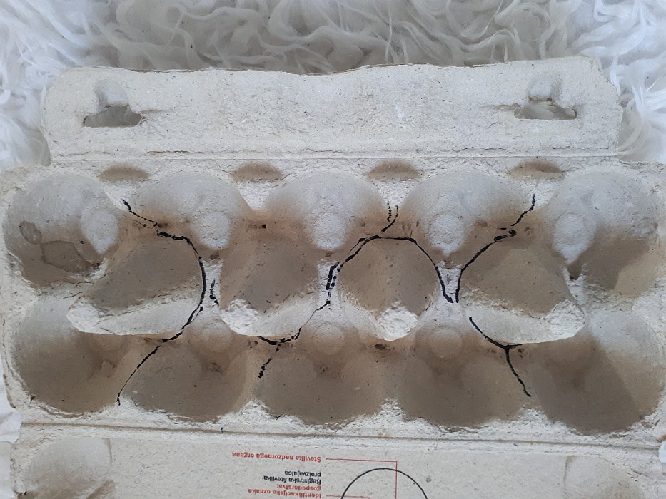 Škatlo za jajca razrežete kot prikazujejo črne linije (upam, da so dovolj vidne). Najprej oba krajna dela in nato notranja dva. Na vivoki del prilepite kljunček iz rdečega papirja in narišete oči, zadaj pa nalepite barvni papir poljubne barve in velikosti. Mi smo narezali pravokotnike in sta jih potem otroka narezljala, da so nastala `peresca` ter jih na koncu nalepila na škatlo.