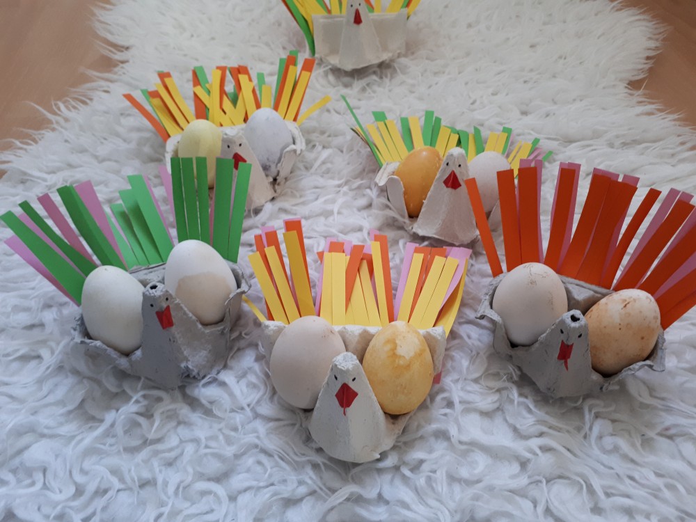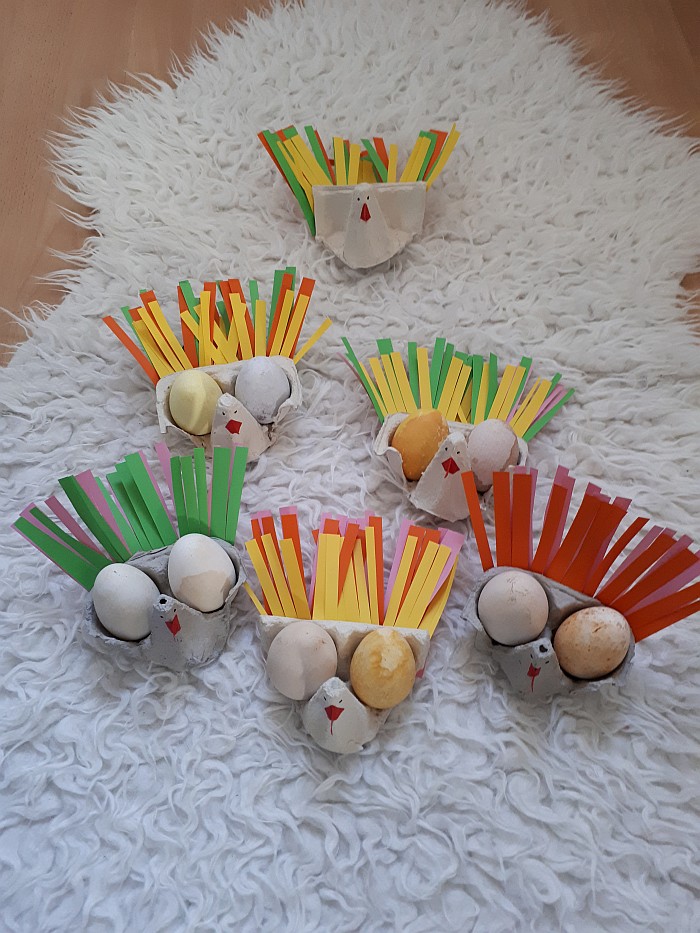 Včeraj popoldan sem šla v Avstrijo in ker nisem bila čisto prepričana ali bo vreme zdržalo in se bodo lahko mož in otroka igrali na travi, sem jim pripravila nekaj zadev za ustvarjanje; razrezala sem material, pripravila šablone, oni so morali nato samo narezati peresca, lepiti in barvati. Vsako leto doma izdelamo stojala za pirhe, v katerih nato pirhe tudi podarjamo. Včasih do zadnjega trenutka tuhtam, kakšna bi lahko izdelali, letos pa se mi je ideja porodila kar sama. Odločila sem se, da bomo reciklirali škatle za jajca in nastale so ljubke in prikupne kokoške. Otrokoma je bilo ustvarjanje tako zabavno, da je moral mož razrezati še nekaj škatel in na koncu je tudi on dodal, da je ideja res super – povsem preprosto za izdelavo, izdelek pa je res čudovit.