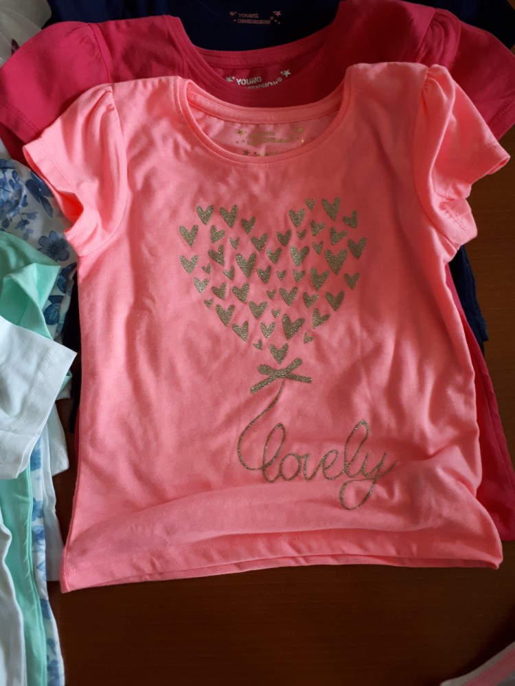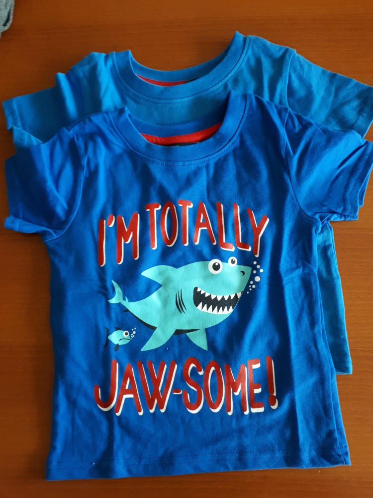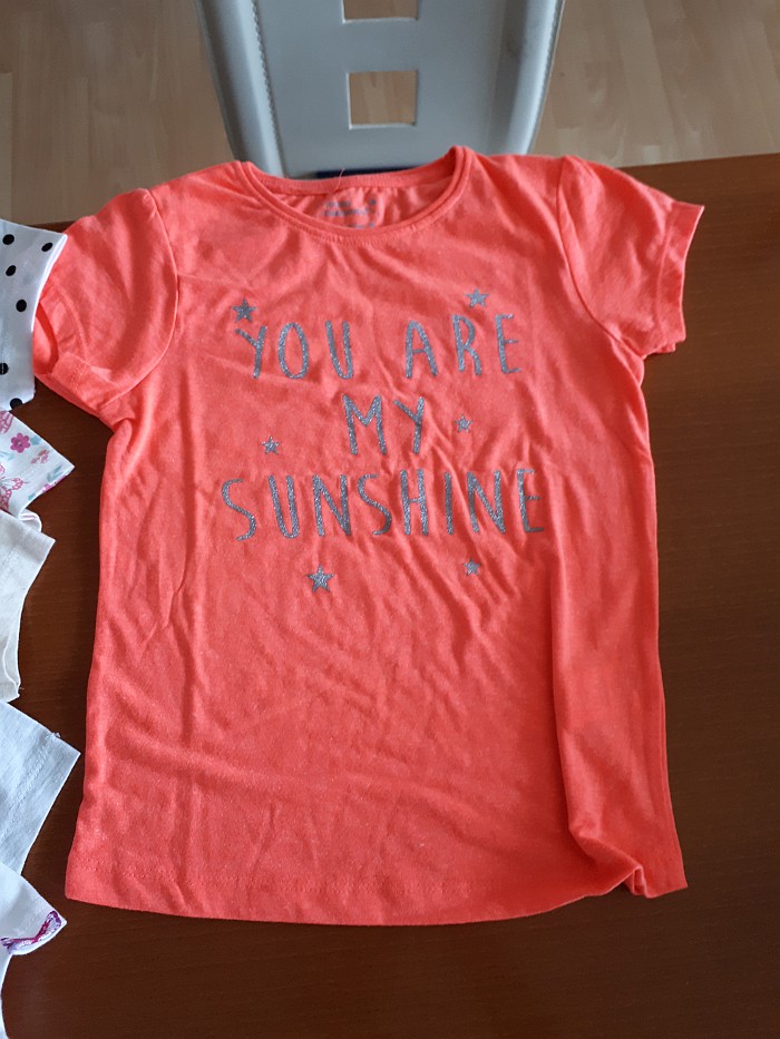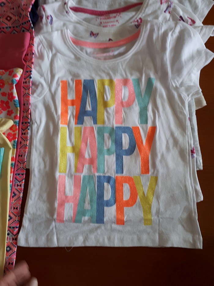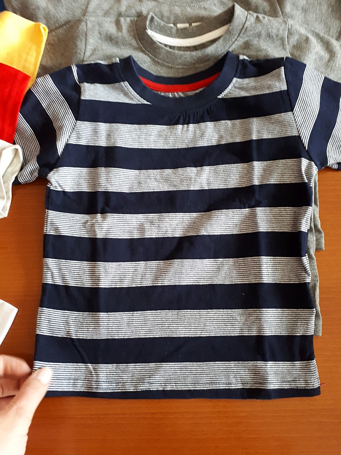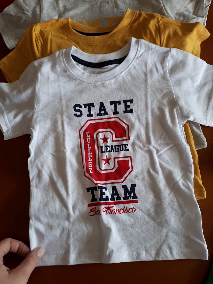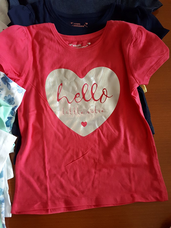 Domov sem prinesla pet vreč oblačil; trenirke, kratke hlače in majice za moža, majice, pulovrčke, sandale, nahrbtnike in perilo zase, majice in kratke hlače ter spodnje dele – trenirke in legice za otroka. Da me ne boste spraševale, ali že imajo kaj poletne kolekcije – ja, vse je že poletno, tudi kopalke, obutev, pokrivala in ostali dodatki, ali imajo kaj znižanj – ja, znižan je kar lep del ženske kolekcije kot so tanki pleteni pulovrčki, jopice, bluze, športna oblačila, majice, tunike, srajce, hlače, tudi pižame, perilo, torbice, nekaj obutve. Na otroškem oddelku ni znižano praktično nič oziroma zgolj par kosov, so pa zato cene res ugodne. Fantovke in dekliške majčke s kratkimi rokavi do velikosti 3 let stanejo 1,70 eur in do velikosti 8 let stanejo 2,00 eur; vsak je dobil 15-20 kosov. To so res lepe in hvaležne majčke; lahko jih perem na 60 stopinj, niso občutljive, lepo se nosijo, imajo lepe potiske in so smešno poceni, tako mi nikoli nobene ni škoda, ko jo zavržem. Poleti ponavadi preoblečemo dve ali tri na dan in zato jih vedno kupim na zalogo, preden bomo šli junija na morje, pa jih bom zagotovo kupila še eno takšno rundo.