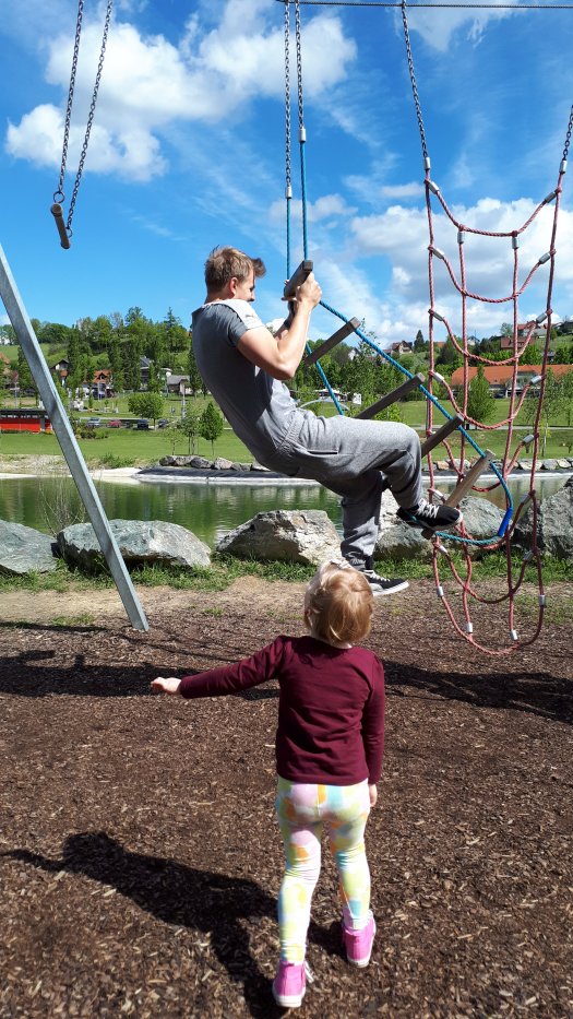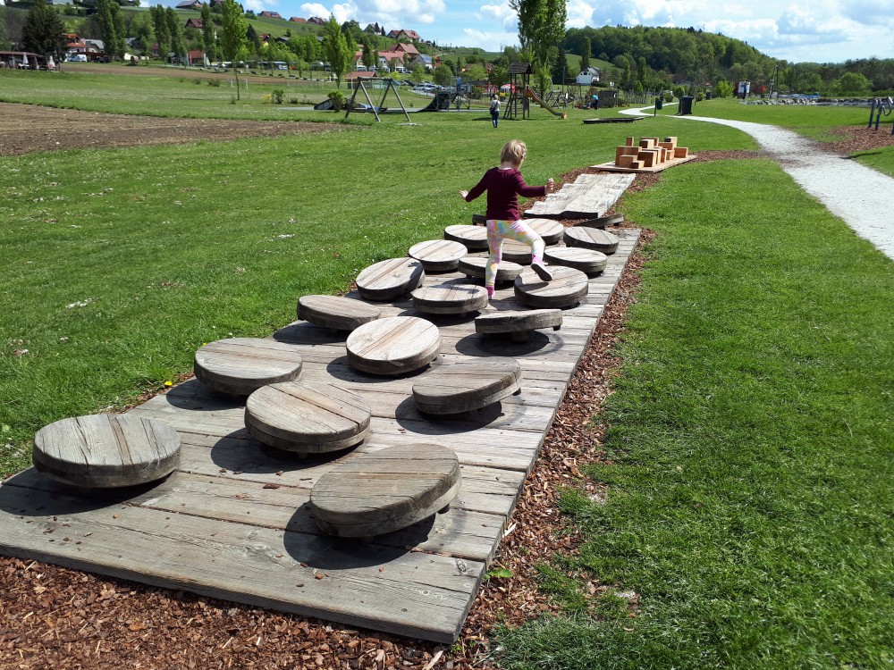 Motorikpark Gamlitz je čudovit park le nekaj kilometrov oddaljen od mejnega prehoda Šentilj, ki je povsem brezplačen (plačljiva je samo parkirnina) in nudi številne zabavne motorične preizkušnje za obiskovalce vseh starosti. Sestavlja ga (več kot) 30 različnih motoričnih aktivnosti oziroma postaj, ki so vriskajoče doživetje za otroke in naporna preizkušnja za odrasle. Nekatere so adrenalinske, zabavne, smešne, druge so prav naporne in zahtevajo ogromno stabilnosti, fizične moči in spretnosti. Poleg igral so tam še gnezda (gugalnice), ploščadi namenjene lovljenju ravnotežja, plezala, gugajoči poligoni, vrtljiva miza, potka z ovirami, fitnes na prostem in cel kup drugih aktivnosti. Posebej všeč mi je, da so vse aktivnosti narejene iz lesa, da so vse postaje preproste, a zelo zanimive in dinamične ter da so aktivnosti razporejene okrog jezerc.