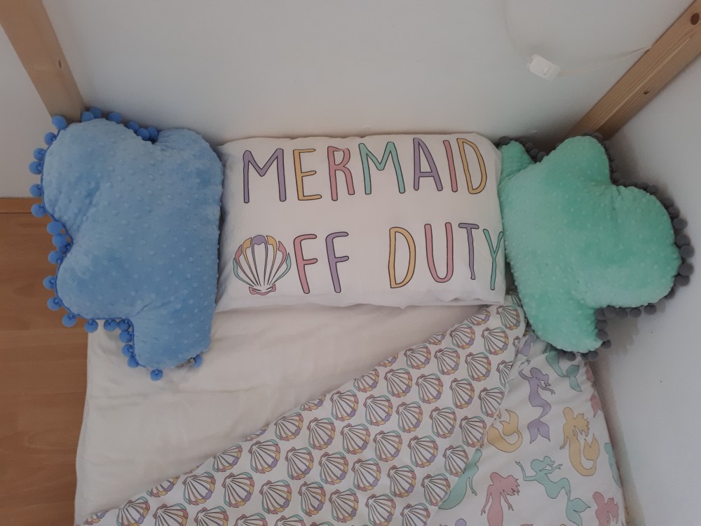 Ste opazili velikansko stensko nalepko? Ria obožuje živali in zato sva se, ko sva urejala sobo, odločila, da jo popestriva s stensko nalepko. Po dveh letih jima ni več zanimiva in bi jo bilo že potrebno zamenjati, tako da bom kmalu naročila novo. Natančno oko vsake mame je opazilo tudi, da se posteljnina ne sklada z barvami predalov za igrače, res se ne, ker je Ria v fazi obsedenosti s princeskami in je nova `Mermaid` posteljnina trenutno njena najljubša, Noe pa se zaenkrat še veliko bolje počuti, če je pokrit z malo odejico in ima tudi on drugo posteljnino. Ne ubadam se s tem, meni je pomembno, da se v svoji sobi dobro počutita, da v posteljah rada in dobro spita, vse barve, dizajnerske harmonije in novitete, me ne ganejo toliko. Včeraj, ko si je šla iskati knjigo, je stopila v sobo in se začudila `Kaj imava nove blazine? Kakšna čarovnija je to?`. Nobena čarovnija; mami je pospravila sobico in čas je bil tudi za nove blazine WOW! baby. Čisto je bila navdušena, kako so mehke, kakšne ljubke cofke imajo, kako ji lepo paše k posteljnini in zvečer je namesto na vzglavniku, spala na tej blazini. No, Noe je ni opazil, dokler je ni zgrabil in vrgel v Rio, ker so zanj blazine namenjene obmetavanju. Ta blazina pa je tudi neke vrste senzorična igrača, saj ima Minky velur izbočene krogce, ki so izredno mehki in prijetni na otip, otrok se lahko igra s cofki, s katerimi je blazina obšita, na drugi strani pa je nevtralen vzorec z zvezdicami. Poleg vseh velikih in malih plišastih igrač, na katerih se ne da spati, so blazine vedno dobrodošle. 🙂 Na fotografijah pa lahko opazite tudi girlando z zvezdicami , ki je čudovit dodatek za hišico, lahko pa jo obesite tudi na steno.