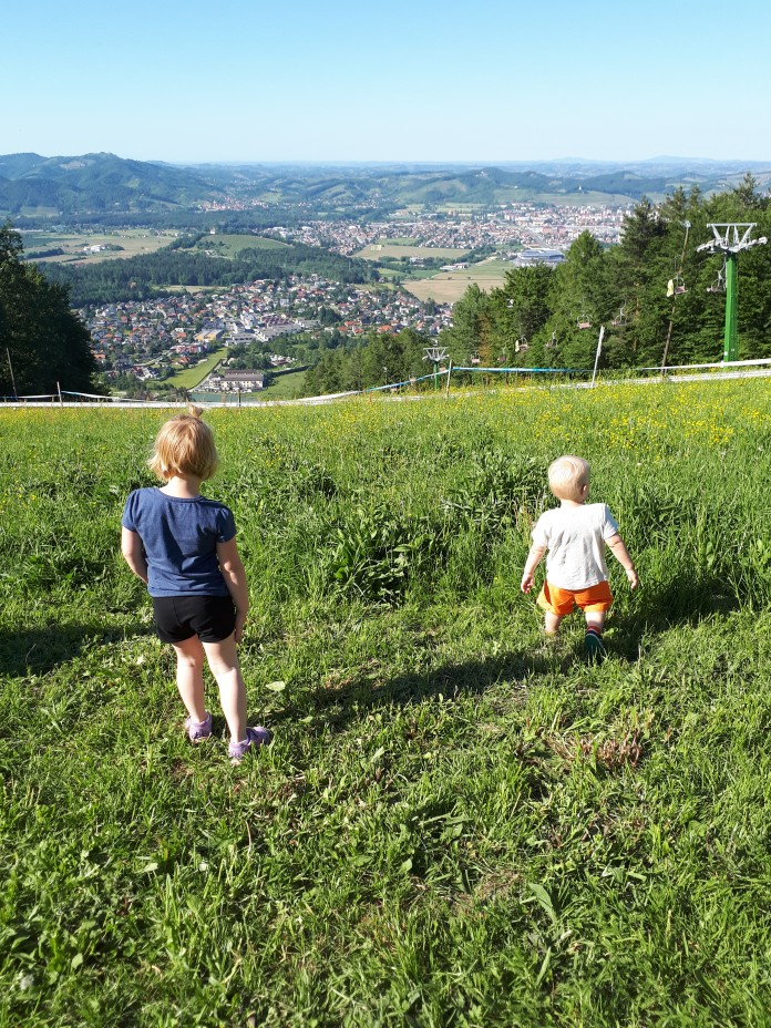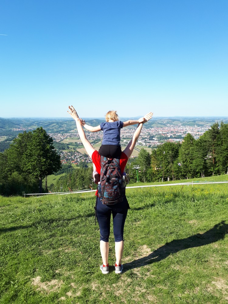 Šli smo brez pričakovanj, brez omejitev, brez nosilke in brez rezervnih plenic. Tudi brez prigrizkov ali dodatnih virov energije in z omejeno količino vode, v nahrbtniku pa smo imeli poleg telefonov samo še paket robčkov in rezervni majčki za otroka. Pa smo prišli na vrh. Brez sopihanja, brez slabe volje, brez tečnarjenja, brez utrujenosti. Ria je prišla gor in dol povsem sama, Noe pa je prehodil pol poti. In jaz sploh nisem čutila napora, malega sem del poti celo nosila, zadnjih 200m pa celo tekla z njim na ramenih, nosila pa sem ga tudi po poti navzdol. Presenečena sem bila nas sabo, a še bolj me je presenetila Ria. Suvereno, brez pritoževanja, brez stokanja, brez slabe volje, celo pot sva se pogovarjali, celo pot sva opazovali naravo, pohodnike in pse, ona pa ni bila niti malo utrujena, niti malo izčrpana in niti slučajno zasopihana. Ponosna sem do neba in nazaj.