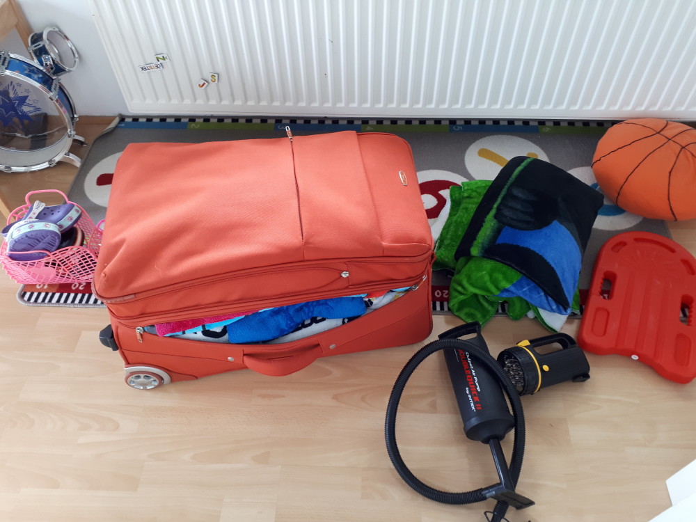 5 ur sem porabila za pakiranje dveh kovčkov – v velikem so otroške stvari, v manjšem so najine stvari, enega toaletnega kovčka – kozmetiko smo letos pakirali v družinski verziji: skupen tuš gel, skupen šampon, skupna krema za sončenje (nobene otroške verzije in odrasle verzije) in treh dodatnih torb.