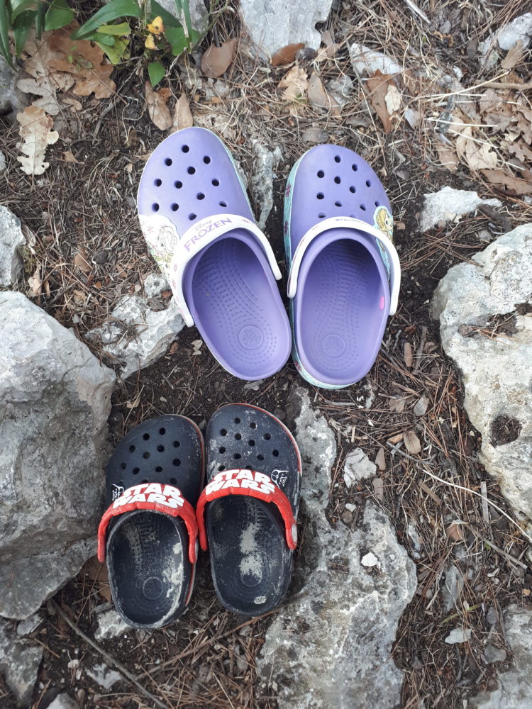 Drugo leto sem ji seveda kupila nove. In leto kasneje je svoje prve, v velikosti 18, dobil tudi Noe in to celo takšne, ki so glede na toploto spreminjali barvo iz rumene v zeleno in obratno. Midva še vedno ne nosiva Crocs-ov, ker se mi še vedno ne zdijo primerni za odrasle, ker mi ne izgledajo lepo na veliki nogi in ker odkrito, sploh ne vem, kam bi jih obula, medtem, ko jih Ria nosi že tretje poletje. Tokrat sta jih lahko izbrala celo sama, v bistvu jih je za oba izbrala Ria in tako je zase izbrala Frozen (bi sploh lahko pričakovali kaj drugega), za Noeta pa Star Wars (žal Ribič Pepe ne obstaja 😉 ). Seveda smo jih vzeli s seboj na morje, kjer so sprobali čisto vse terene, se skopali v vodi, bili polni mivke, se veselo gulili na poganjalcu, velikokrat leteli po zraku in udarjali ob tla (samo zato, da so lučke svetile) in preživeli. Vse terene, vse razmere, vso premetavanje, plavanje in cepetanje. Dovolj zaprti so, da jima not niso uhajali kamenčki, a hkrati enostavni za obuti in sezuti, praktični so, ker so lahko natikači ali pa se z eno potezo spremenijo v sandale. In ne glede na to, kako zelo jih včasih nisem marala, se mi sedaj zdijo super izbira.