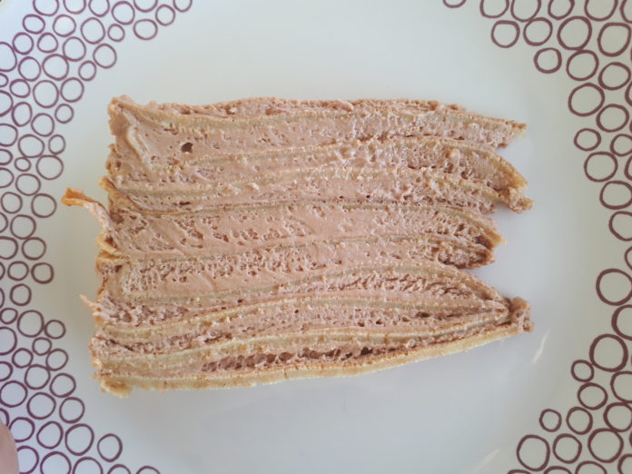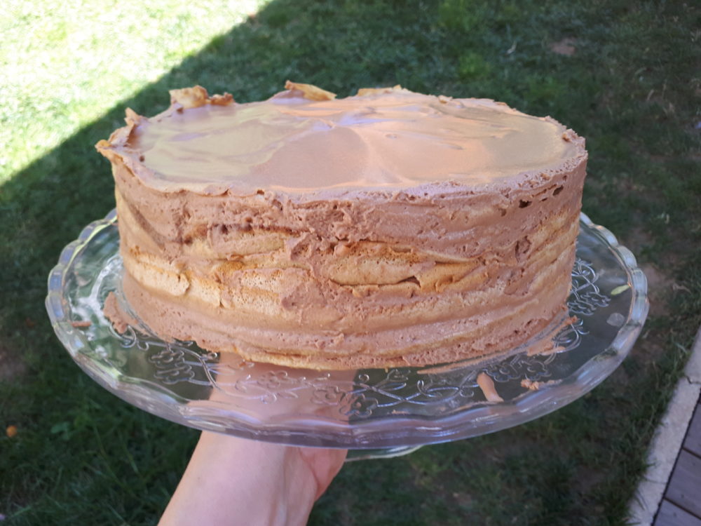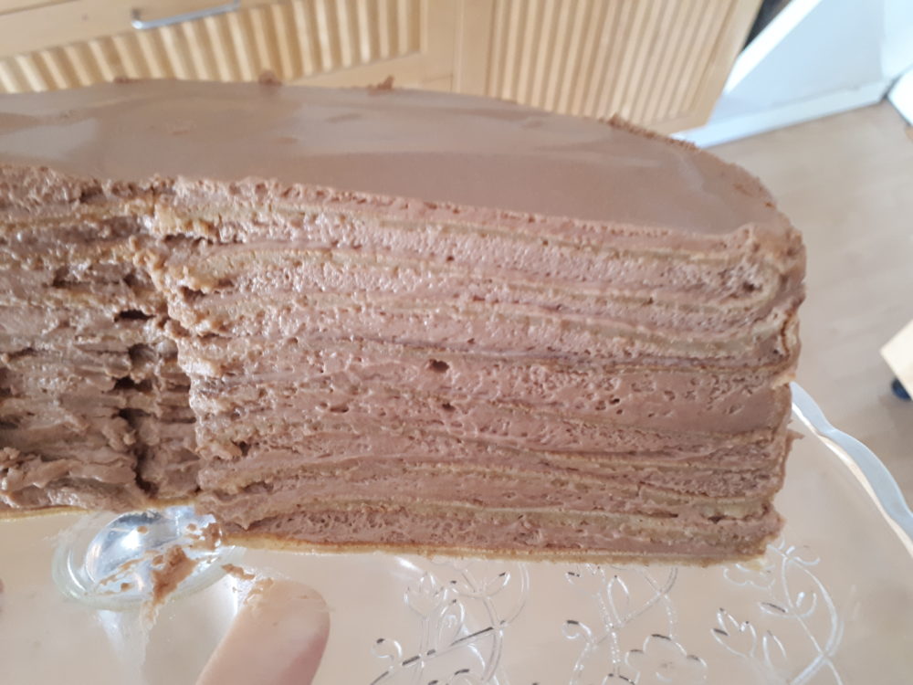 Vzemite obod za torto premer 24 cm, na dno položite palačinko, nanjo namažite štiri ali pet žlic kreme in prekrijte z drugo palačinko. Postopek ponavljajte, dokler vam ne zmanjka kreme – zadnjo palačinko premažite z dvema ali tremi žlicami kreme. Postavite za tri ure v hladilnik in torta je nared.