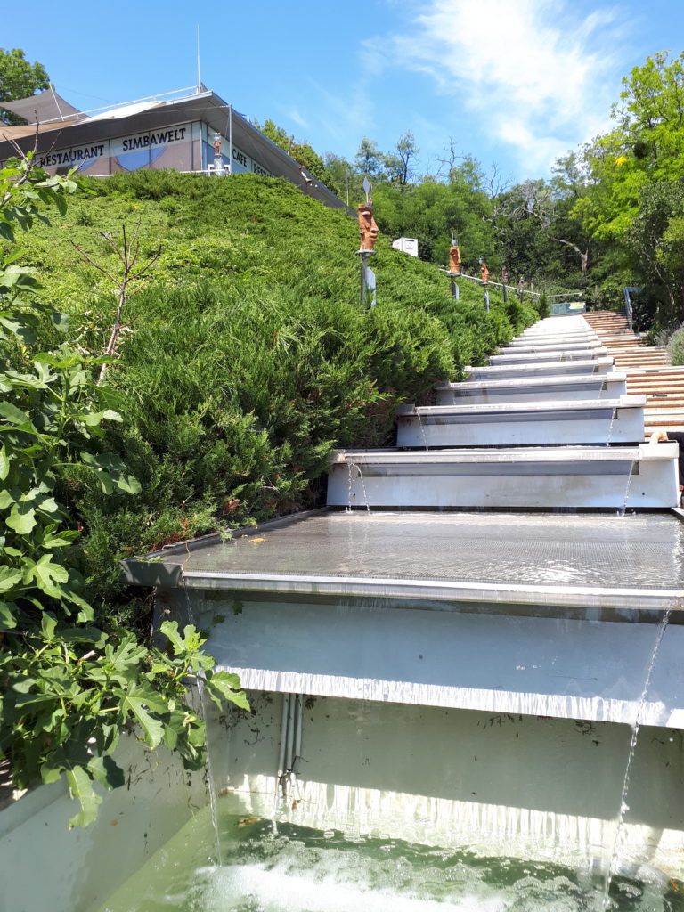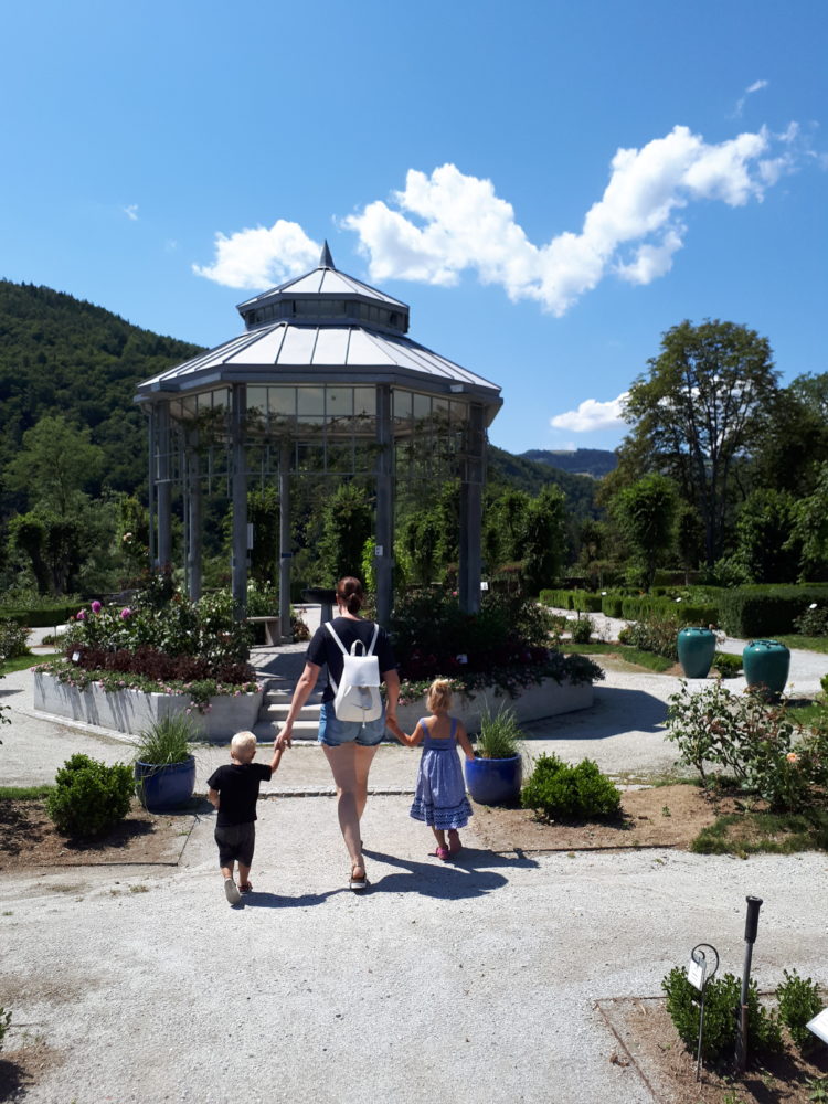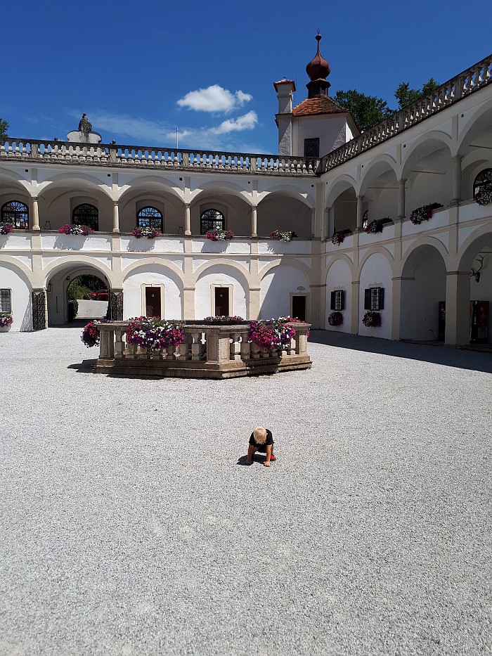Petek je bil neznosno vroč in ko smo se okrog poldneva odpravili proti živalskemu svetu Herberstein, smo se veseli dvojega; mali počitka, ki ga je bil že pošteno potreben, mi pa sence in družbe živali. O parku Herberstein si, preden smo se odločili, da ga obiščemo, nisem kaj veliko prebrala. Če so živali, če so zraven še kakšna igrala in če imajo prijetno urejene sprehajalne poti, je to – to, ničesar drugega ne potrebujemo in če smo že v tistem delu Avstrije je obisk pač neizbežen. Otroka nista imela pričakovanj, razen želje po tem, da vidite živali, pa tudi jaz jih tokrat nisem imela, zato me je čudovit in domačen živalski vrt za katerim se skriva dih jemajoč grajski vrt in ogromen bel grad Herberstein pustil brez besed. Grajski vrt je poln najrazličnejšega cvetja, grmičevja in drevja, čudoviti stopničasto urejeni slapovi so idealni za pomakanje otroških rokic, viseči most, ki te pripelje do opic in dalje do vrta pa čudovita popestritev sprehoda, da o razgledu sploh ne govorim. Videla sem že precej gradov, ki so me sicer navdušili, a so me prav zaradi svoje enoličnosti in podobnosti vedno puščali nekako ravnodušno, Herberstein pa je ogromen bel grad, ki zaradi obilice cvetja dobesedno cveti in v katerem se v vodnjaku sredi dvorišča razmigavajo male zelene žabice in s svojim reganjem navdušujejo otroke. Seveda smo morali vse te čudovite lokacije izkoristiti za veliko fotografiranja.