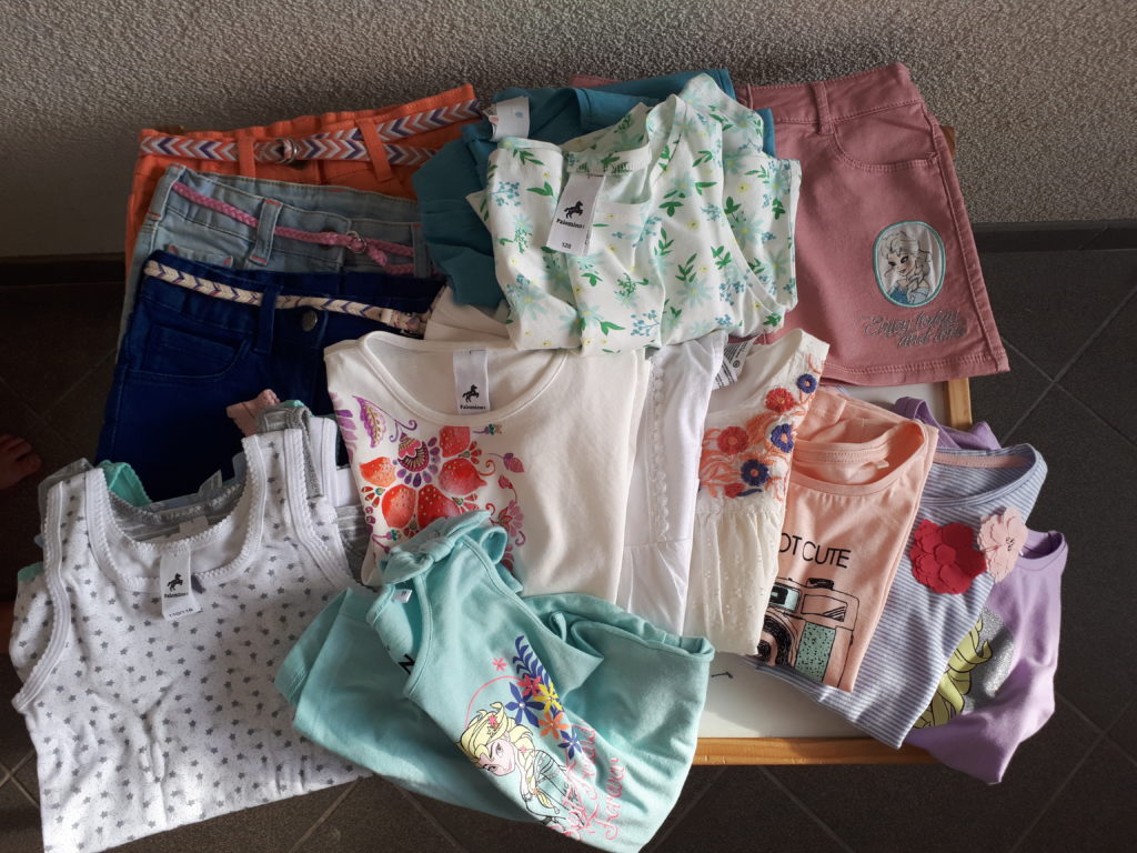 Na splošno imam raje, da imata stvari preveč kot premalo, ker se potem sploh ne obremenjujem, ko jih mečem v smeti, kadar so tako umazane, da jih niti detergent za odstranjevanje madežev ne reši. In večja kot sta, bolj pogosto se to dogaja. Madeži na kolenih in riti so neznosni, dobesedno. Ne glede na to, kaj namažem nanje, kako dolgo jih namakam, na koliko stopinj jih perem, so še vedno tam. pride obdobje, ko v enem tednu zavržem trojne pajkice od hčerke in tri spodnje dele trenirk od malega, včasih pa cel mesec nobenih. In še vedno se čudim, kako jim to uspe. V enem mesecu običajno napolnimo eno veliko vrečo odpadnih oblačil, ki jih nato v H&M zamenjamo za kuponček s popustom, v zadnjem mesecu pa smo napolnili že tri; priznam, spet sem sortirala oblačila in takrat res ne prizanašam. Poleg tega pa otroka noro hitro rasteta, malemu je v treh mesecih noga zrasla za dve številki, Rii pa za eno in tako nam ostane veliko oblačil in obutve, ki jih nosita enkrat ali dvakrat ali pa sploh ne.