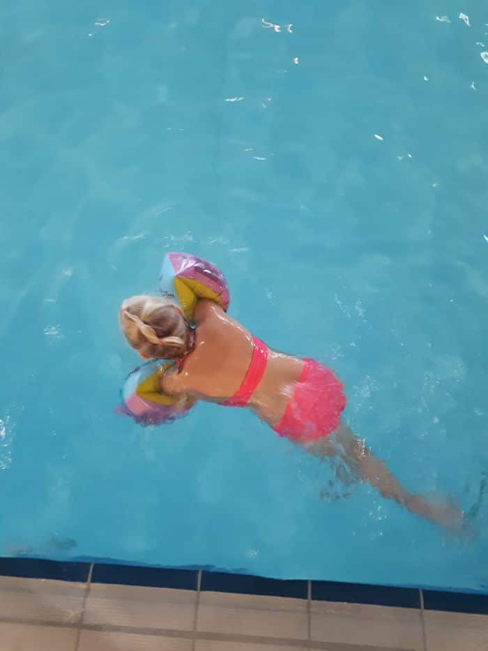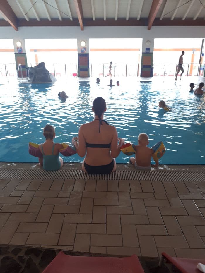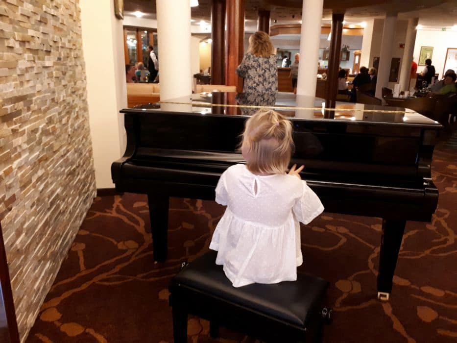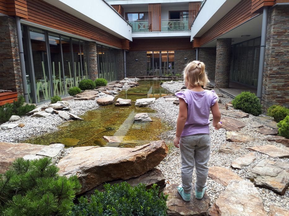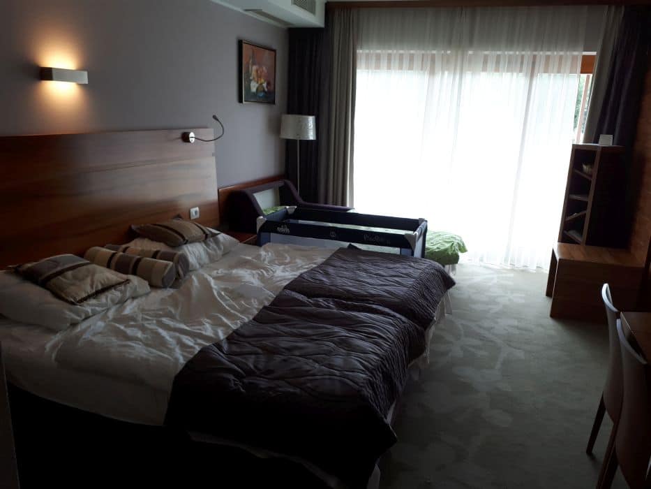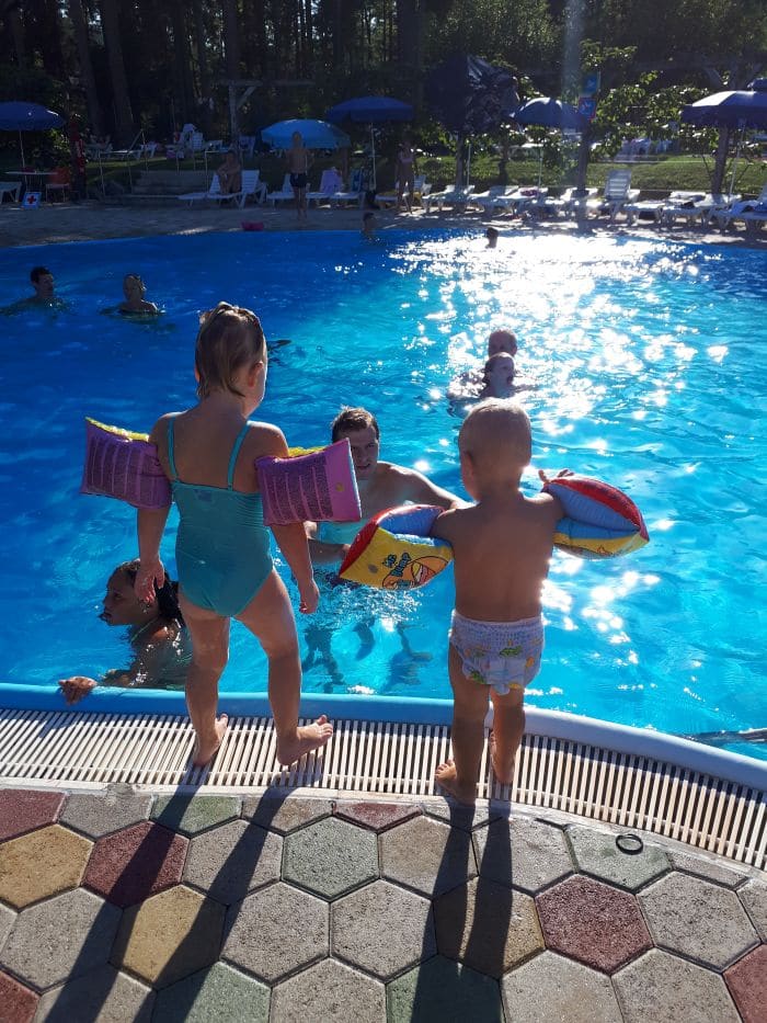 Ne glede na to, kako lepa in velika je soba, kako pester je nabor izdelkov za osebno nego (hotel ima EU Marjetico za ekološko učinkovitost in okoljevarstveno ustreznost, zato uporabljajo recikliran toaletni papir ter izdelke za osebno nego brez embalaže oziroma z okolju prijazno embalažo in embalažo za ponovno polnjenje) in kako dobro je založen mini bar, se je otrokoma seveda mudilo na bazen in v petek popoldan smo izkoristili še zadnje res lepe, sončne in vroče ure preteklega vikenda za kopanje v zunanjem bazenu. Skakanje v vodo, potapljanje, plavanje in spuščanje po toboganu je bilo tako zabavno, da sploh nista hotela na večerjo. Zelo všeč nam je bilo, da do drče vodi tlakovana klančina, tako da sem jaz nadzirala zgoraj, mož pa spodaj in sta se otroka sama spuščala po toboganu in vračala nazaj gor; super nadomestilo za stopnice, ki so ponavadi spolzke, ozke, strme in za malčke zelo nevarne. Zunanji bazeni nudijo igrala za otroke ter tobogan in dve drči, kar je ravno dovolj, da se lahko otroci veselo spuščajo, a ne preveč, da bi predstavljalo nevarnost.