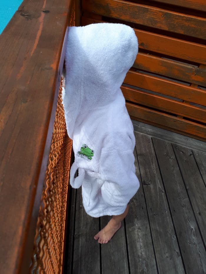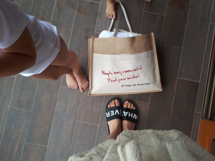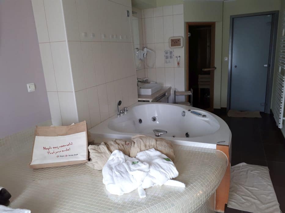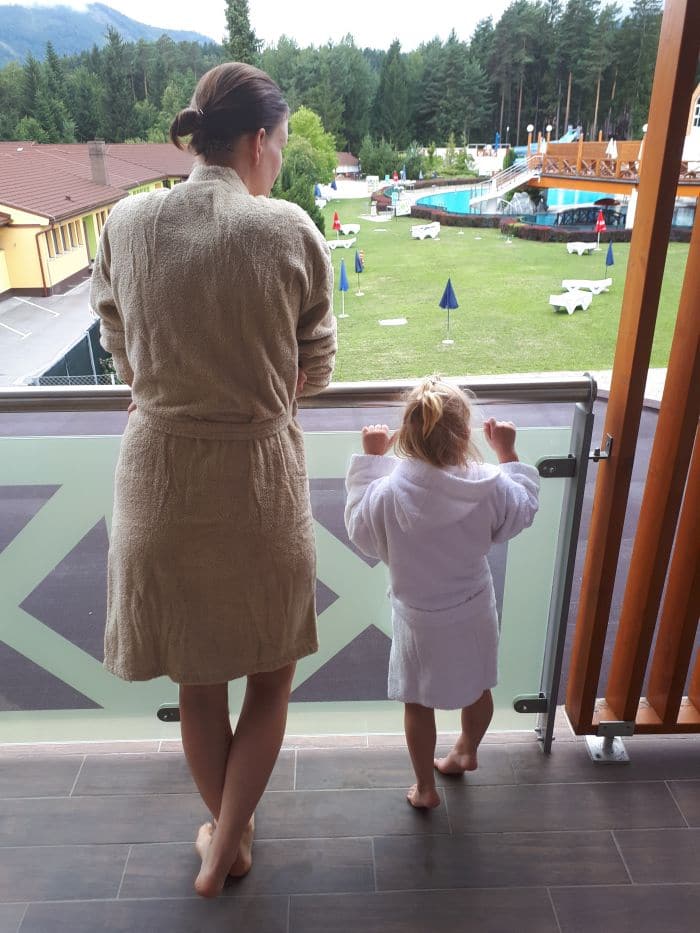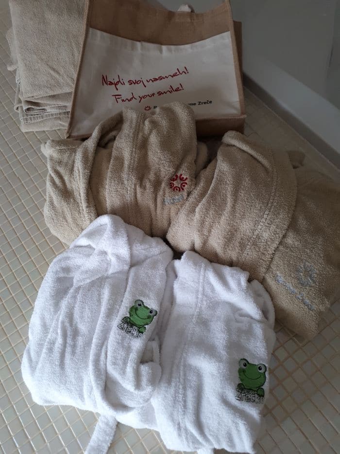 Naš cilj je bil od doma oddaljen le 40 km, a se mi je, ko smo prispeli in se razpakirali, zdelo, da smo 500km od doma. Popoln odklop, brezskrbnost in uživancija, kot da realnost `tam spodaj` ne obstaja. Vikend v Termah Zreče – boljše skoraj ne bi moglo biti. V hotelu Atrij nas je pričakala ogromna soba z dvojno zakonsko posteljo, z velikim raztegljivim ležiščem za Rio in prenosno posteljo za Noeta ter ogromno kopalnico z masažno kadjo, tušem in savno. Ria se je čudila, kaj vse imamo v sobi in medtem, ko se je Noe zagnal v košarico jabolk, naju je ona spraševala, čemu služi ta `lesena soba`. Še posebej pa jo je navdušil televizor, ker je to pomenilo, da bosta lahko gledala risanke. Kako nezahtevni so otroci. 🙂 Brisač je bilo toliko, da bi lahko brez težav tam preživeli teden dni, pričakali pa so nas tudi kopalni plašči, dva odrasla in dva otroška z žabcem Zrečkom (otroških kopalnih plaščev še nikjer nisem videla).
