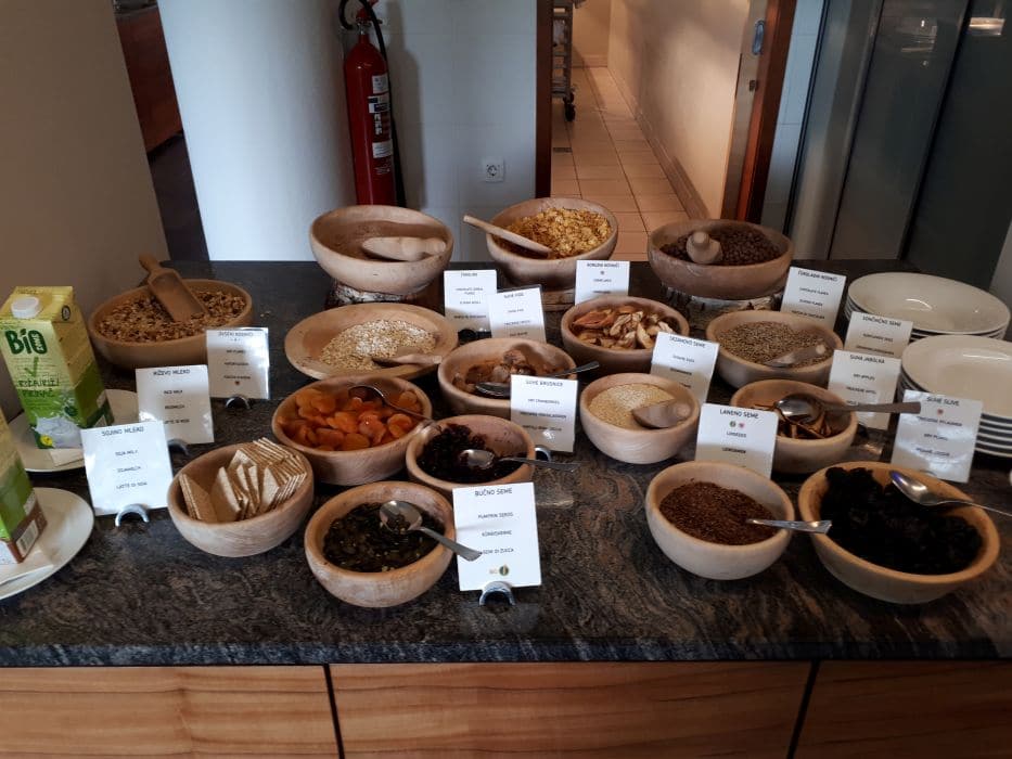 Prav toliko kot sem se veselila, da mi ne bo potrebno kuhati, sem se spraševala ali bosta otroka jedla. Včasih znata pošteno komplicirati in upala sem, da jima bo kaj všeč, ona dva pa sta me totalno presenetila in jedla kot velika; vse od goveje juhe z zvezdicami in srčki, ribe in piščanca, do krompirja, riža z ješprenom in celo rdeče pese. Če sem se jaz pri zajtrku navduševala nad kosmiči, suhim sadjem, semeni ter izborom jogurtov in domačih marmelad, so se preostali trije člani družine navduševali nad pečeno slanino, hrenovkami, štručkami, jajci in pršutom. Izbire je toliko, da se za vsakega kaj najde, poleg tega je poudarek na lokalno pridelani in domači hrani, imajo pa tudi vegetarijansko/veganski bio kotiček.