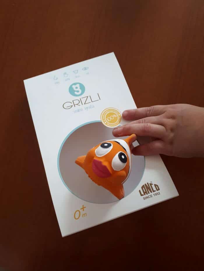 Vodne igrače Grizli so izdelane iz naravnega kavčuka iz drevesa Hevea, ne vsebujejo BPA, PVC, ftalatov (mehčal ali plastifikatorjev, ki vplivajo na gibljivost igrače) in nitrozaminov (ki se pojavljajajo v lateksu, hrani, kozmetiki in so izredno rakotvorni oziroma karcenogeni), so izdelane ročno in biološko razgradljive. Ko jo primeš v roko, je igrača zelo mehka, prijetna na otip, ne povsem gladka, a nežna, zelo prožna, prijetna za grizenje, stiskanje, žvečenje, slinjenje, igranje, živahnih barv in odlična za senzorični razvoj otroka. Vsak je dobil svojo – Ria ribico Nemo, ker obožuje risanki Nemo in Dory in Noe hobotnico Biserko, a se z obema zares igra le Noe. Hobotnico grize, vlači za lovke, jo zvija, razteguje, ribico Nemo pa stiska in stiska, ker misli, da bo zapiskala, pa ga nikakor ne uboga. Gre za vodne igrače, ki nimajo odprtine, kar pomeni, da voda in vlaga ne moreta uhajati vanje; tako se tudi plesen v njih ne more narediti in so posledično za otrokovo zdravje povsem neškodljive (in ne piskajo, kar je plus za starše in vse ostale prisotne), poleg tega jih lahko perete v pomivalnem stroju, jih čistite s čistilom za igrače ali kakšnim naravnim pripravkom in so ves čas lepe.