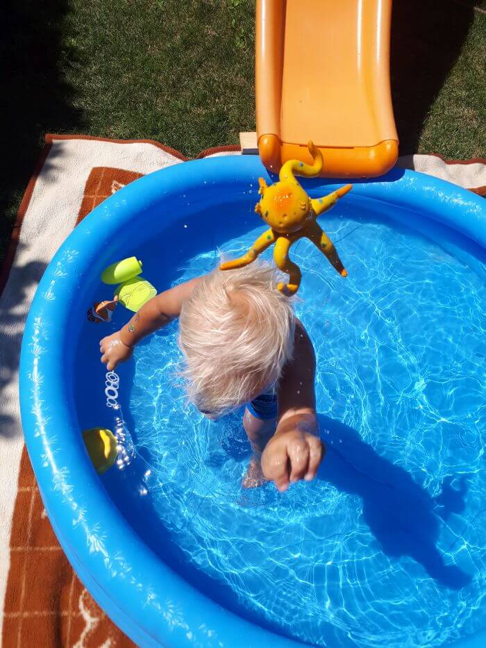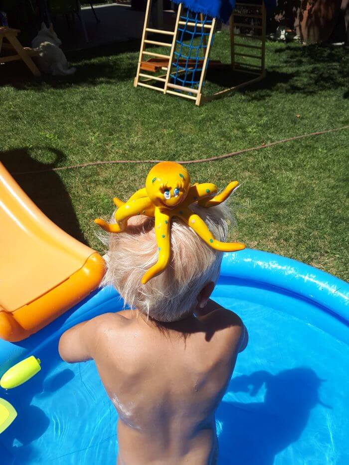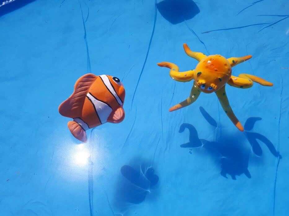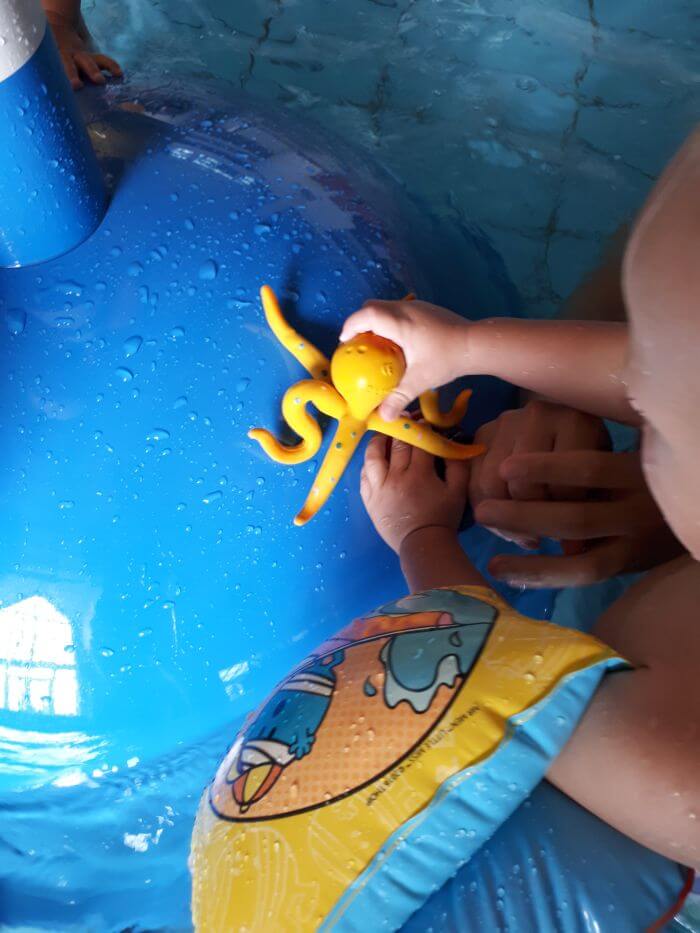 Igrači sta šli z nami na kopališče, v julijsko/avgustovski vročini sta nam delali družbo na domačem vrtu, bili pa sta tudi z nami v termah. Noe se je s hobotnico igral celo med vožnjo v Zreče, kar je potrdilo, da mu je hobotnica veliko bolj zanimiva kot ribica. Glede na to, da mu manjka še ena petka (zob), točno vem, zakaj ima raje hobotnico – ker jo lahko grize, slini in žveči in samo čakam, kdaj ji bo zmanjkala kakšna lovka. V trenutnem naboru igrač na robu domače banje imamo kozarčke, posodice in žličke, ki služijo polivanju in špricanju, zaradi česar imamo v kopalnici velikokrat manjšo poplavo, poleg tega pa sem velikokrat še jaz vsa mokra ter hobotnico in ribico, ki dogajanje vselej spremljata od blizu. Tudi meni je hobotnica totalno posrečena. Zadnjič je zadišala celo našemu psu in zadnji trenutek smo jo rešili gotove smrti.