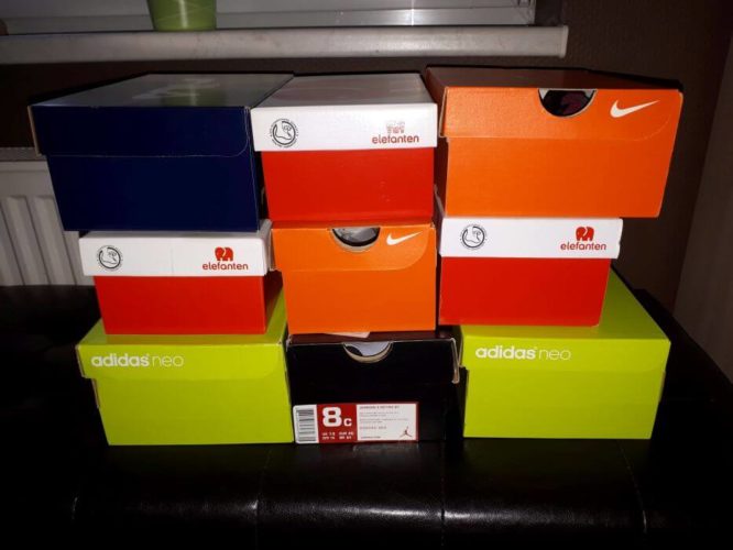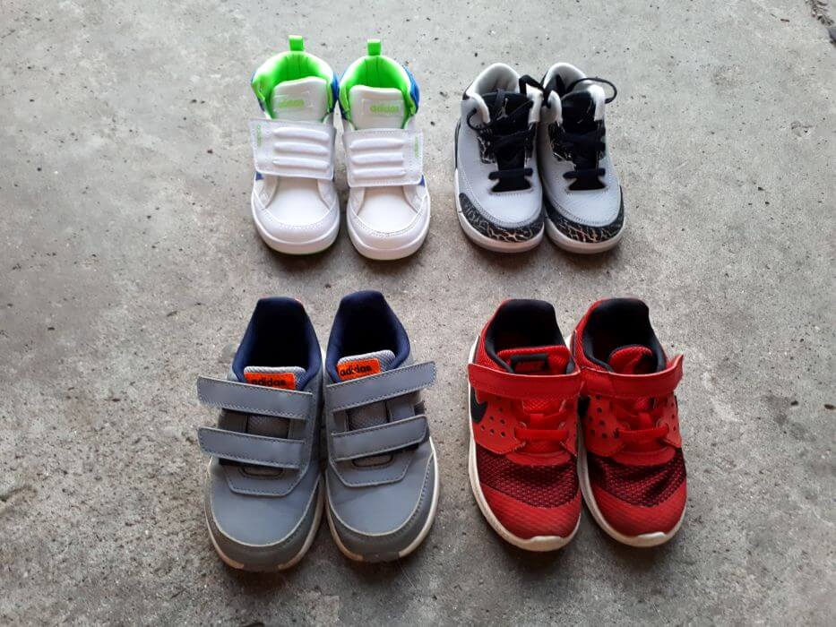 Z oblačili običajno ni težav, vse pogosteje pa se zalomi pri obutvi. Koliko parov potrebujeta, kaj bosta nosila, ko bo hladnejše vreme, kaj bosta obula, ko bo dež, kateri teniski ne premočijo, kaj lahko obujeta na malo lepša oblačila, kateri čevlji so dovolj udobni, a tudi kvalitetni, kateri se ne bodo takoj uničili, ogulili in razlezli, na prehodu jeseni v zimo pa nujno potrebujeta gležnjarje. Na hitro naštejem, da potrebujeta vsak tri pare teniskov – ene tanjše, ki dihajo za toplejše dneve, ene debelejše za hladnejše in mokre dneve in ene malo lepše, ki niso ravno za v vrtec (iz vrtca pridejo novi teniski kot bi bili stari pet let, pa me to sploh ne moti, a zato imam vedno še eno rezervo), gumijaste škornje, ki so nujni ob deževnih dneh ter ene nizke in ene visoke jesenske čevlje, kar pri Rii ponavadi pomeni še dva dodatna para lepih visokih teniskov, ki jih lahko nosi tudi na krilca in oblekce ter vsaj ene lepe jesenske čevlje, ki so ponavadi kakšni jesenski gležnjarji (balerink res ne maram, ker se mi zdi, da slabo vplivajo na nogo in so primerne samo za suho vreme), pri Noetu pa še ene tanjše in ene debeljše nizke jesenske čevlje ter gležnjarčke, ki jih nato nosi tudi ob vstopu v zimo, ko so temperature že nižje, a še ni snega.
