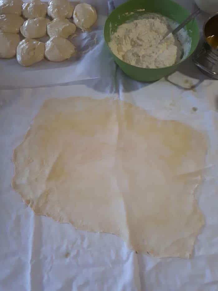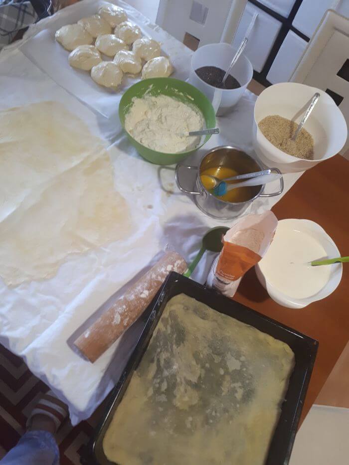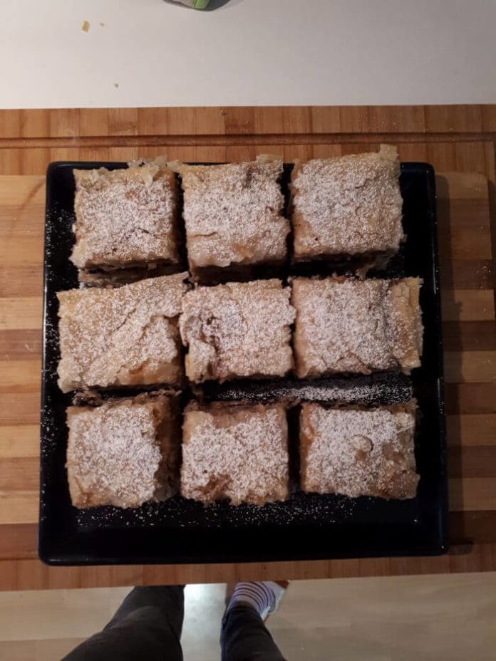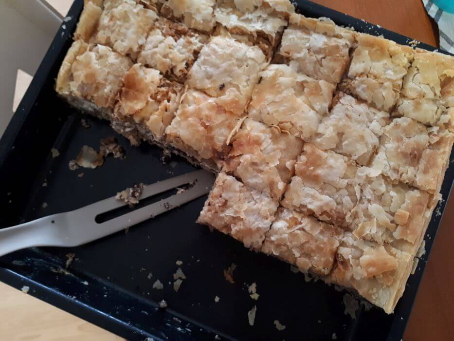 Včeraj sem za pripravo, vse od priprave testa do zlaganja plasti, porabila dve uri, nato se je še dobro uro pekla. Sanjska je. Mož in oče sta včeraj, še preden se je povsem ohladila, pojedla vsak 3 kose. Vedno se strogo držim recepta, le količino masla vselej podvojim – namesto 250 g masla za prelivanje uporabim 500g masla. Tako je gibanica res sočna, mehka in noro dobra. Za prste polizat! Da sploh ne omenjam, da je bilo vlečeno testo tako prožno in so bile plasti tako tanke, da se je videlo skoznje ter mi je na koncu polovica vlečenega testa ostala.