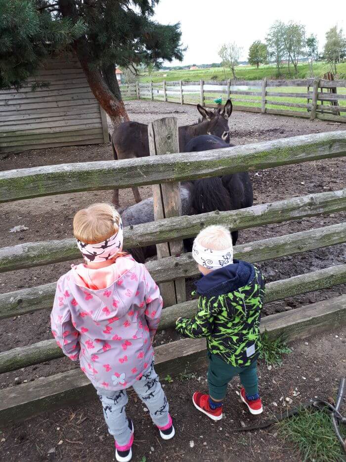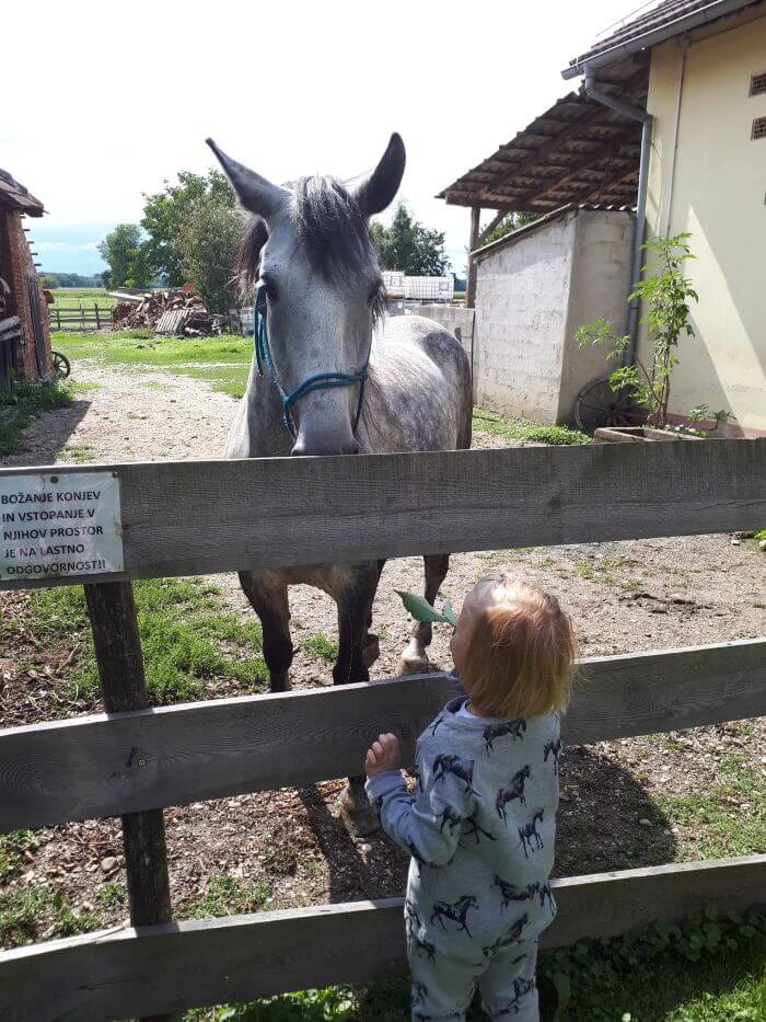 Kar ostala bi v Klavdijinem ateljeju, pa otroka nista imela obstanka in je bilo vse preveč zanimivo, da bi ostalo nedotaknjeno, tako da smo se hitro spakirali, še preden bi kaj pristalo na tleh. Ker pa smo se proti Mariboru peljali mimo dvorca Rakičan, smo se odločili, da se kljub temu, da jahanje ne bo mogoče, ustavimo še tam. Dvorec je res čudovit, a ker so bili otrokoma bolj kot dvorec, zanimivi konji, smo se odločili, da si dvorca ne ogledamo ter raje na avtomatu v kavarni dvorca kupili brikete in z njimi hranili konje. Odlična zamisel – avtomat z briketi in super vir zaslužka. 🙂