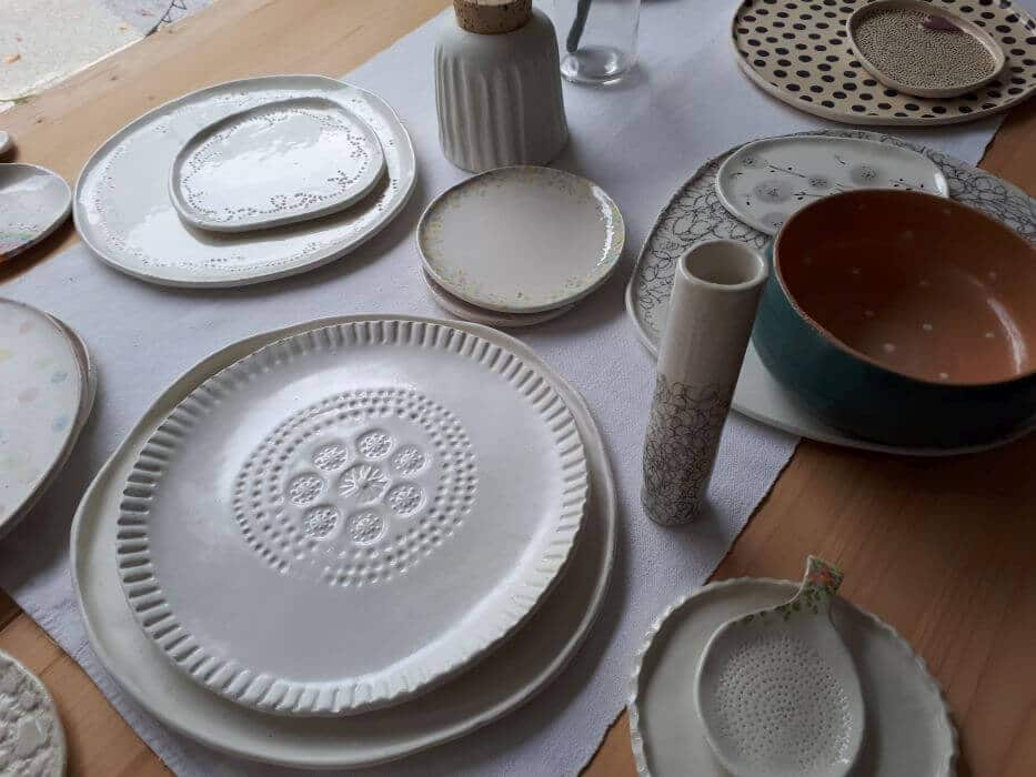 Tudi v nedeljo je deževalo. Zaradi slabega vremena v celem vikendu terase sploh nismo uporabili, pa tako lepa je bila in s pogledom na jezerce. Sta se pa vsaj otroka igrala na njej; stari tramovi, ki so obdajali teraso, so bili zanju bradlje, na katerih sta urila svoje ravnotežje in hitrost. Zaradi slabega vremena so se nam nedeljski plani porušili in odločili smo se, da po zajtrku krenemo proti domu, še prej pa sem morala jaz nujno obiskati atelje. Že več kot leto dni sem imela željo obiskati atelje It`s Pepa, oblikovalke in ustvarjalke Klavdije Sakovič, ki v Murski Soboti izdeluje prekrasne keramične izdelke. Njene skodelice, krožniki, podstavki in posodice niso pravilnih oblik, nimajo enakomernih linij in niso do popolnosti obdelani, a so prav zaradi tega tako čudoviti, posebni in unikatni. `Nepravilnosti` jih delajo popolne in drugačne, piko na i pa dodajo poslikave, ki so minimalistične, preproste, a srčne in čudovite. Samo zaradi nas je bila Klavdija v nedeljo že pred deveto v ateljeju. Samo zato, da sme lahko jaz kupila dve skodelici za čaj in krožnik za pecivo, da sem si lahko napasla oči, da se je lahko Ria igrala z več kot 50 let starim gugalnim konjičkom in da sem lahko zavidljivo vzdihovala vsakič, ko mi je povedala, da je kos, ki sem ga izbrala, že oddan. Vse bi imela, res vse. Še posebej pa me je navdušila njena kolekcija s 24 karatnim zlatom in prav nestrpno čakam in navijam za kolekcijo z bakreno barvo. Ta bi bila res moja – moja.