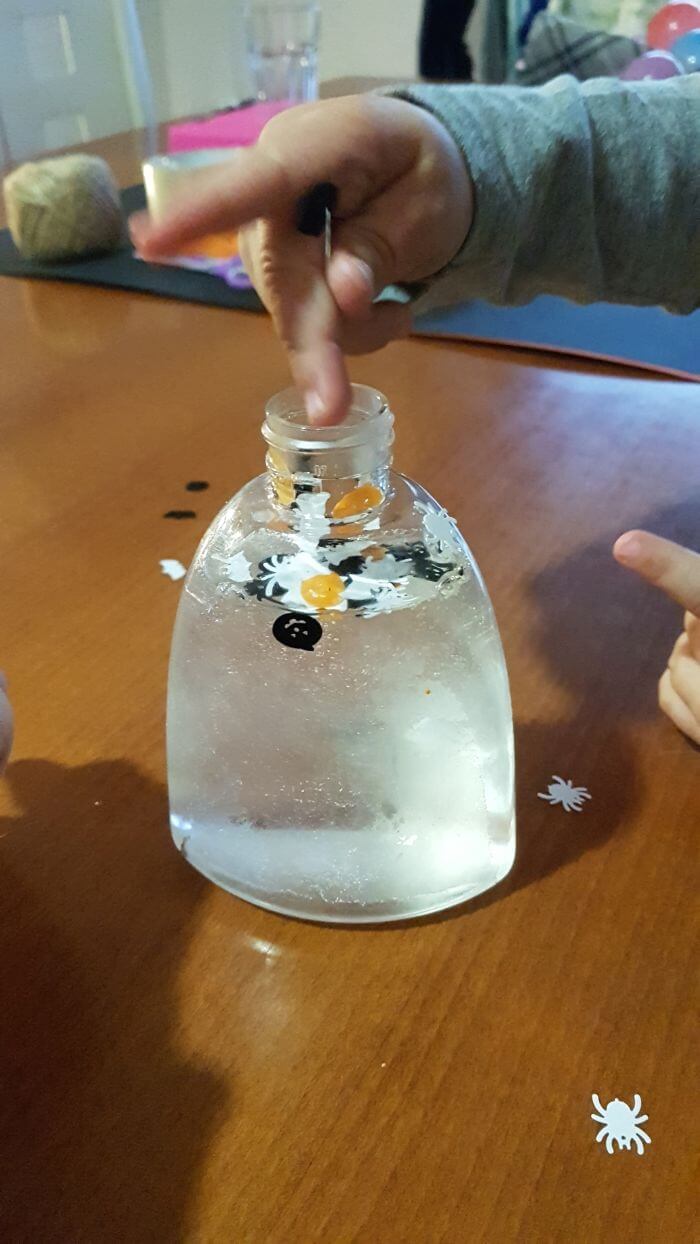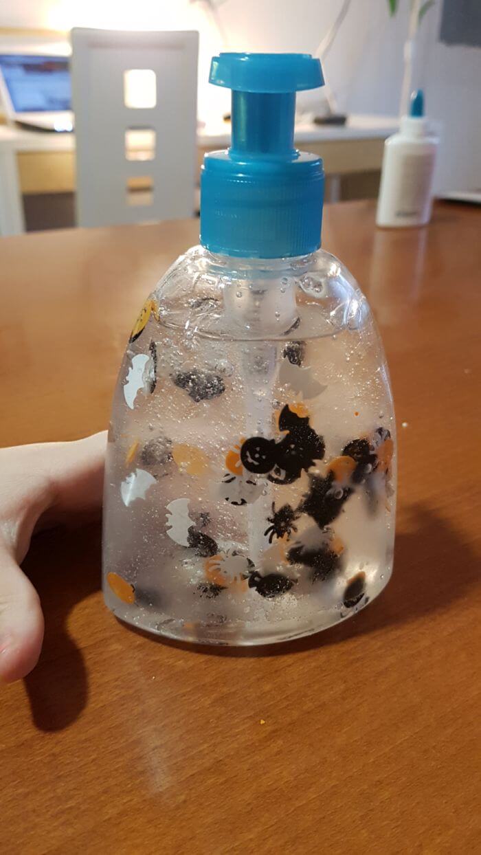 Če bi se zadeve spomnila kaj prej, bi naročila oziroma poiskala v kakšni trgovini čisto prozorno stekleničko za tekoče milo, tako pa smo tekoče milo v prozorni steklenički kupili v trgovini in smo morali odstraniti nalepke. Mučno, zoprno in zamudno delo, poleg tega nalepka sploh ni šla povsem dol, pa smo poskušali na vse načine. No, je pa zato steklenička izgledala še malo bolj strašljivo, zadimljeno in popraskano. Čisto za noč čarovnic. Izdelava je smešno preprosta. Odprete stekleničko, vanjo zmečete želeno dekoracijo – super so kakšne težje zadeve, a jih nismo nikjer dobili in smo zato uporabili kar te lažje, zaprete in premešate. Nastane strašljivo milo, ki je celo didaktična igrača in je otrokom sila zanimivo. Zdaj si bosta roke še raje umivala.
