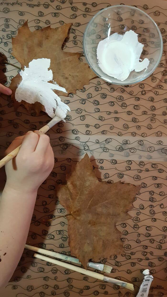 Nabrali smo posušene javorjeve liste, jih obrisali s papirnato brisačko in prebarvali z belo tempero. Ko so se posušili smo nalepili oči ter z alkoholnim flomastrom narisali usta. Če nimate samolepilnih oči, jih lahko tudi narišete.