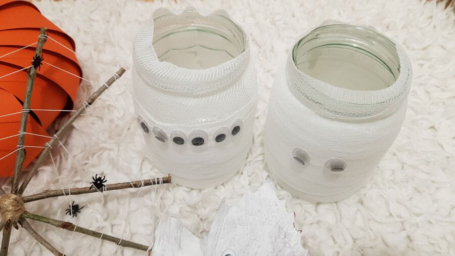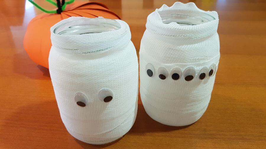 Čist kozarec od vložene zelenjave ali sadja ovijemo s povojem; najboljši je elastični, konec zalepimo s tekočim lepilom in na sprednjo stran nalepimo oči. Po želji lahko dorišete usta, a nama se je zdelo, da jih ne potrebujeta.