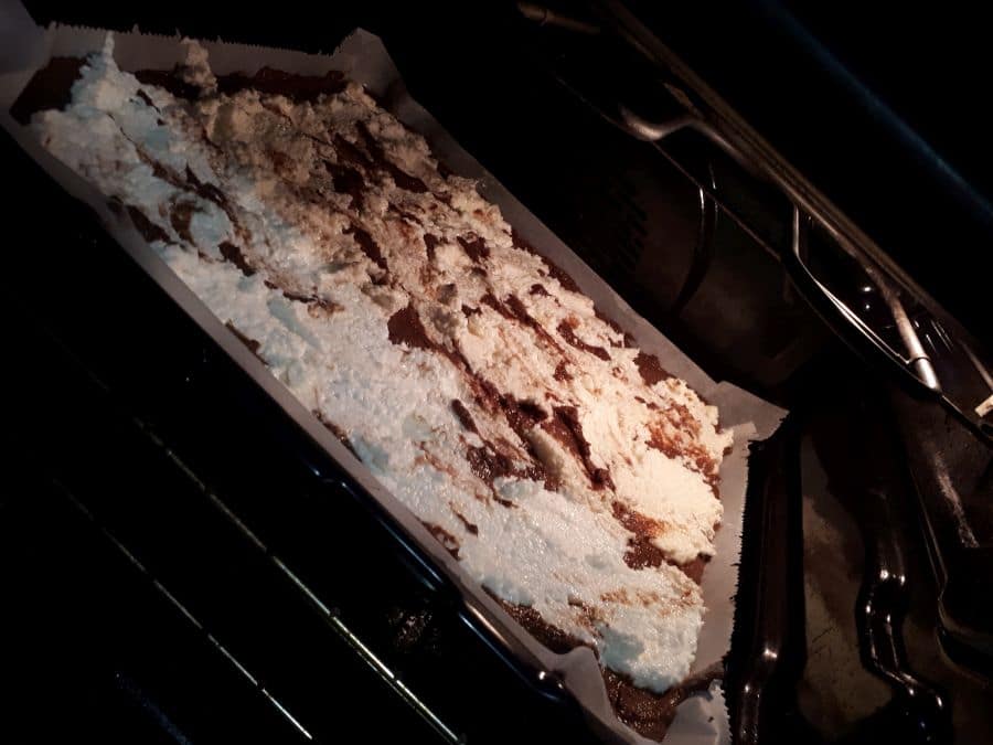 Vse sestavine zmešamo, da dobimo kremasto zmes, ki jo z žlico naložimo na kakavovo zmes. Kepe ne rabijo lepo izgledati, lahko jih preprosto `namečete` v kakavovo osnovo ali jih lepo polagate kot žličnike.