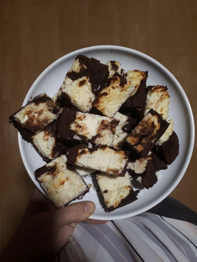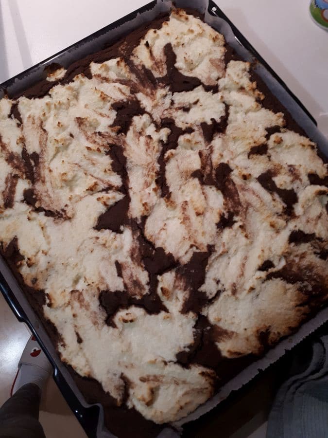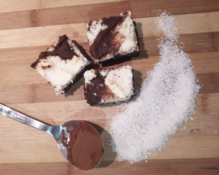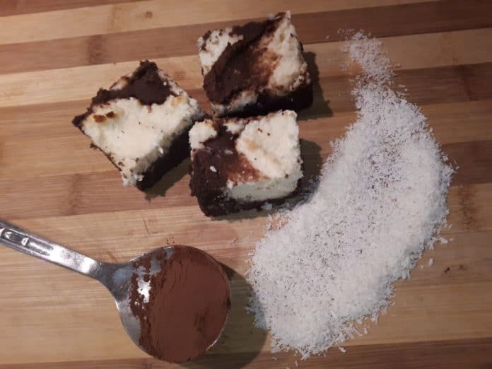 Recept za kakavove kocke s kokosom in kislo smetano, se je pred časom potikal po eni izmed FB skupin in sem ga seveda poskusila narediti; v originalni različici z moko in sladkorjem in res je bilo dobro, tokrat pa sem se odločila, da bom naredila brez glutensko različico, brez sladkorja, z dodatkom več mlečnih izdelkov in s fino kokosovo moko. Nastalo je zelo okusno pecivo in z veseljem smo ga pojedli.
