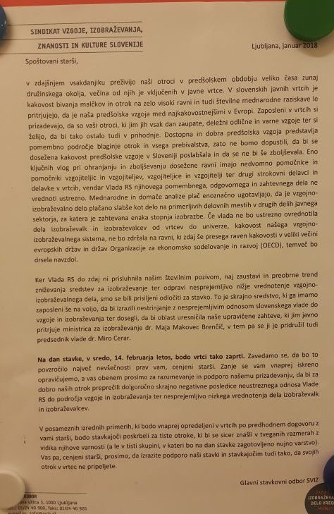 Razumem vas. Podpiram vaše zahteve in se strinjam z vašimi stališči. Podpiram vašo stavko, čeprav menim, da ni pravi način izražanja zahtev niti doseganja ciljev in kot sem pred dnevi že zapisala na FB strani, želim si, da bi vsakdo dobil plačilo, ki bi bilo ekvivalentno njegovemu delu, a vas v tej odločitvi ne morem podpreti. Kam pa naj dam svojega otroka, če ne v vrtec? Bo kdo izmed članov sindikata, članov glavnega stavkovnega odbora SVIZ, mojemu oziroma vsem našim delodajalcem razložil, da ta dan ne moremo v službo, ker nimamo varstva za otroke? Ker ne moremo koristiti pravice, ki nam pripada, ker ne moremo biti deležni storitve, ki nam je bila s pogodbo obljubljena in za katero plačujemo? Imamo (pre)mlade starše, ki so še delovno aktivni in nobene alternativne izbire za varstvo otrok.