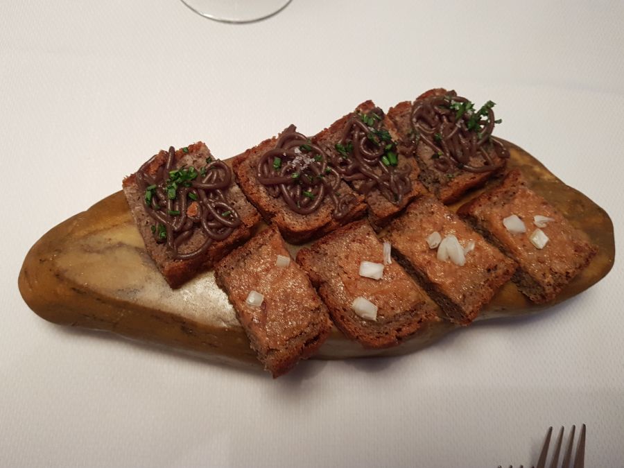 Medtem, ko sta moška komaj dobro pogledala jedilni list, sem jaz nestrpno čakala na hrano. Izbrali smo ena-ena; vsak par en mesni in en ribji meni in se ob prijetnem klepetu prepustili dobri hrani, vsi razen mene, pa tudi kapljici. Še preden smo naročili smo lahko svojo lakoto na hitro potešili s pozdravom iz kuhinje; domač kruh z dvema namazoma, zaseka in čebula ter bučni namaz postrežen na kamnu. Ob teh okusnih grižljajih se jaz vedno sprašujem, zakaj je tega tako malo. V resnici bi lahko pojedla 3 konkretne kose kruha, pa mi najbrž ne bi bilo dovolj. Zelooo okusni so bili. Čisto po mojem okusu.
