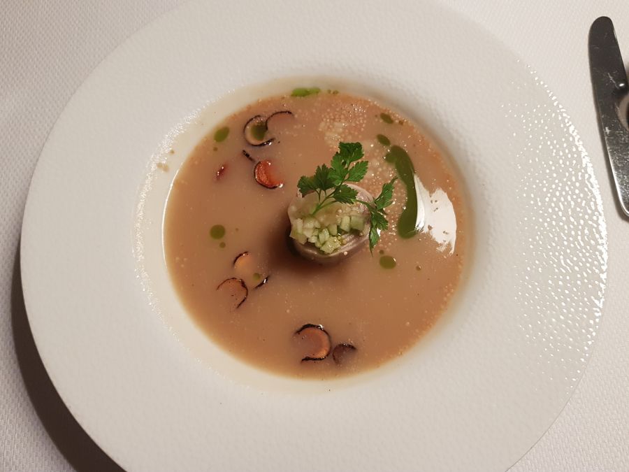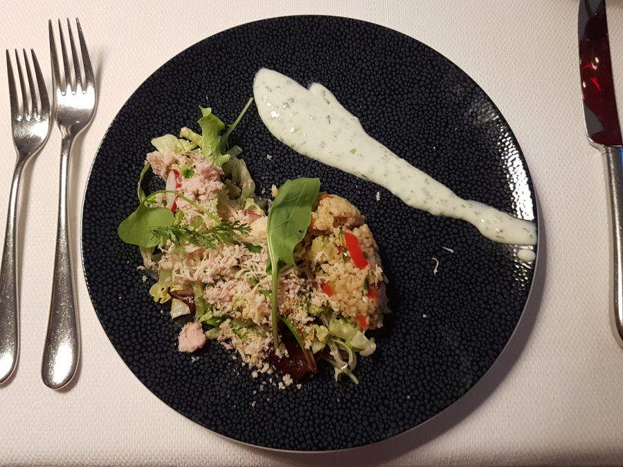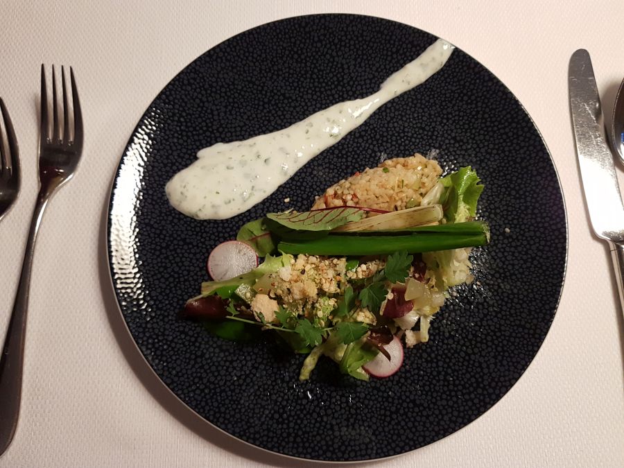 Za hladno predjed smo dobili pomladno solatko: Pomlad – Tabouleh s kumaricami mariniranimi v ginu, jogurtovim prelivom z limono in domačo tunko pri mesnem meniju ter konopljinimi semeni pri ribjem. Sveža solatna mešanica, ki dejansko spodbudi tek in te drži v nestrpnem pričakovanju naslednjega hoda. Sledila je topla predjed: Zelena in zelena – juha iz gomolja zelene z jabolki Granny smith, orehovim zavitkom in gosjimi jetri pri mesnem ter amarantom pri ribjem meniju. Gomoljna zelena ima precej specifičen okus, ta juha pa je bila nežna in kremasta; orehov zavitek je bil domiselna in svojevrstna zakuha, ki je zaokrožila celotno juho, zemeljski okus zelene pa je odlično dopolnila svežina jabolk. Njaaam. Moj mož je rekel, da mu je bila od vseh jedi juha najbolj všeč in bi jo lahko še kar jedel. Jaz pa sem seveda nestrpno čakala glavno jed.