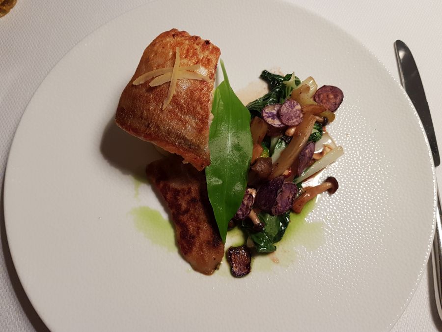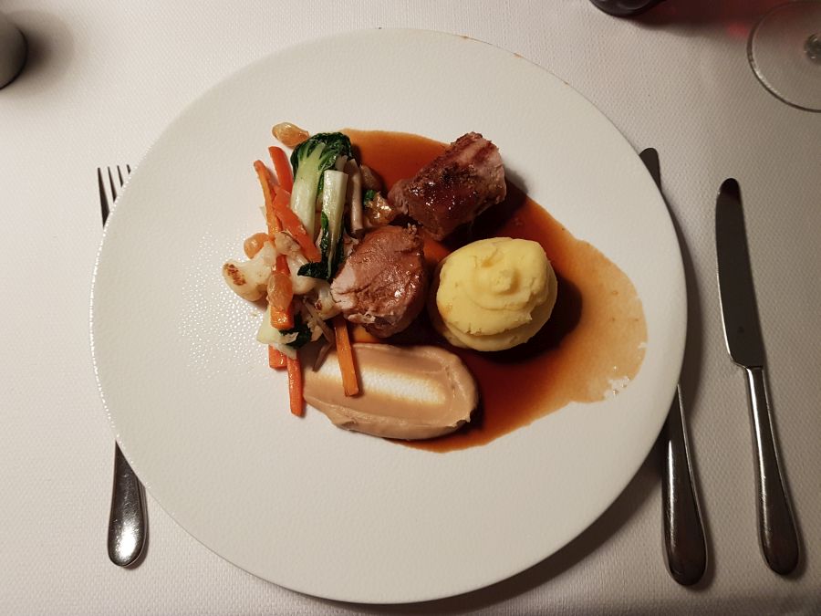 Glavna jed mesnega menija, ki ga je naročil mož je bil Pujček – pečen svinjski file s pretlačenim krompirjem, korenčkom, gomoljno zeleno in cvetačo, pri ribjem meniju pa Sulec – pečen file sulca s pretlačenim krompirjem, pekinškim zeljem, gobicami in praženimi lešniki. V restavracijah si običajno naročam ribje jedi ali jedi z morskimi sadeži, saj jih doma pripravljam bolj redko, poleg tega jih obožujem, a so pogosto prenežne za moj okus. Jed mi je bila zelo všeč; nežna, okusi so se lepo dopolnjevali, riba je bila popolno pečena in posebej me je navdušilo pekinško zelje, ki ima izrazit okus po kitajski hrani, a ko sem pokusila samo grižljaj svinjskega fileja z omako, sem bila res navdušena. Čeprav sicer nisem ljubiteljica svinjine, je bilo meso mehko, sočno in v kombinaciji z zelenjavo res popolno.