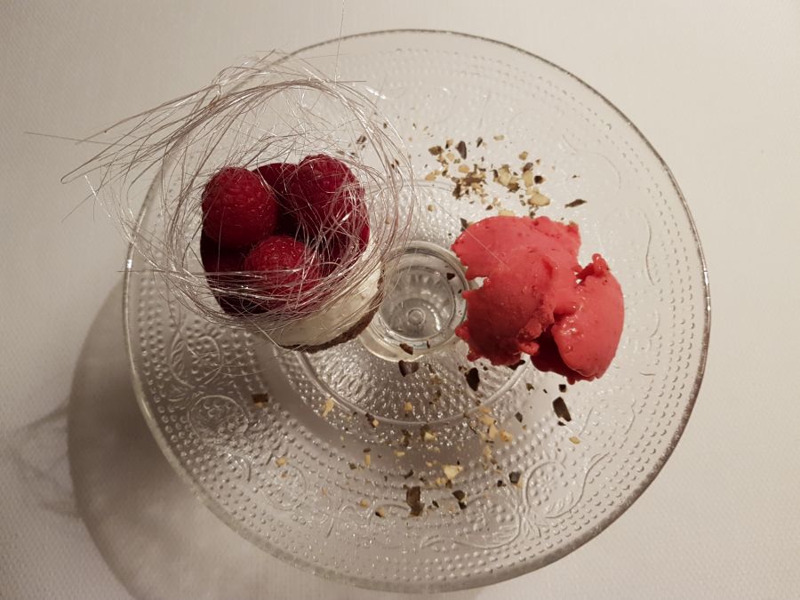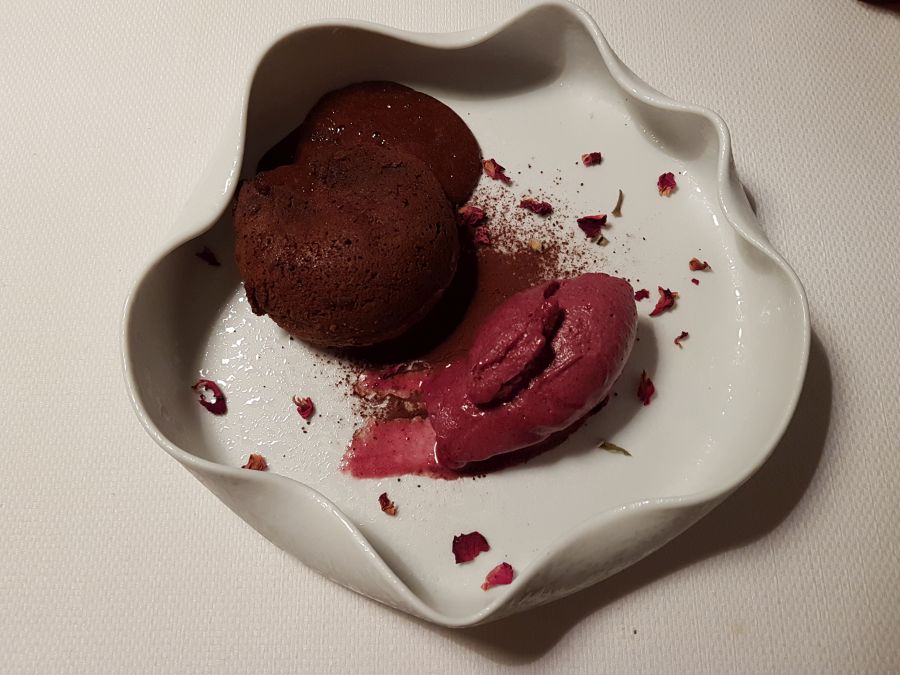 V meni tokrat ni bila zajeta sladica, a smo si jo vendarle privoščili. Zame brez sladice ni popolnega kosila ali večerje, sploh pa ne na Tednu restavracij. Midva sva naročila čokoladni souffle z jurkinim sladoledom ter bučno tortico z malinami, prijatelja pa enako. Obožujem čokolado in čokoladne sladice, tako da je bil čokoladni souffle moja prva izbira, a sem ga potem prepustila možu in izbrala bučno tortico, itak sva na koncu pojedla pol-pol. 🙂