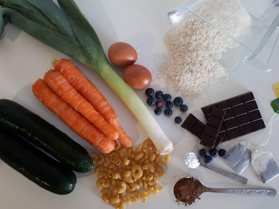 Če ju doleti driska oziroma diareja, prav tako najprej povečam vnos tekočine. Voda je v obeh primerih zelo pomembna, saj zadostna hidracija spodbuja prebavo in poskrbi, da ne pride do izsušitve, elektrolite pa nadomeščamo z glukozo in elektrolitskimi praški. Pri prebavi ima poleg tekočine najpomembnejšo vlogo hrana in v takšnih trenutkih se spomnim na jedi, ki mi jih je, ko sem imela prebavne težave, kot otroku kuhala mama: prežganka – juha z jajcem in kumino, na vodi kuhan riž, korenčkova juha z zdrobom in jajcem, kuhan krompir, kuhana zelenjava, naribana postana jabolka, suhe kuhane testenine, prepečenec, krekerji, slane palčke, banane in temna čokolada. Prav zadnja je otrokom vedno najljubša – najprej dve žlici juhe, dve žlici riža in nato dve vrstici čokolade – ker pač morata. Včasih jima ponudim tudi oglje, a jima ni simpatično, čeprav sploh nima napačnega okusa.