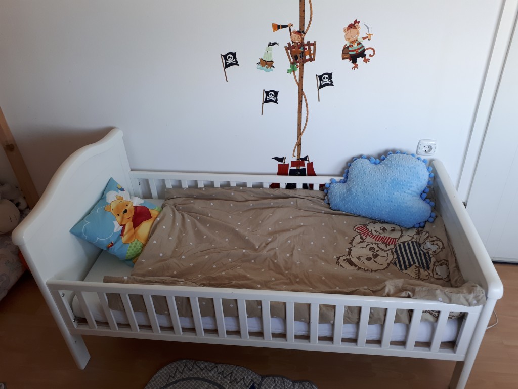 66. Lesena posteljica Lip Poljčane, velikost 140x70cm, masivni les – 50 eur, ležišče Ko-Si, kokosova vlakna in lateks, velikost 140x70cm – 70 eur