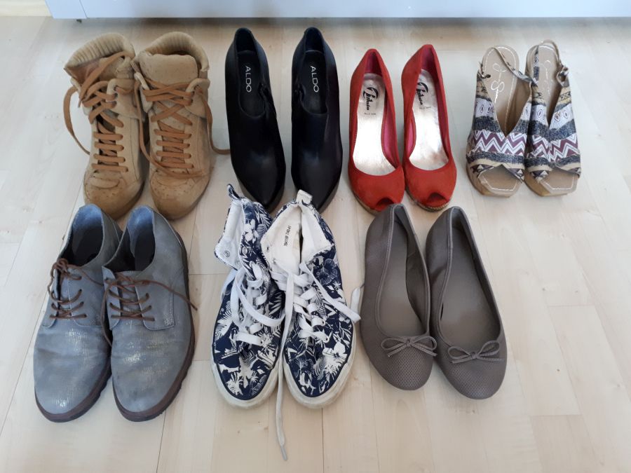 48. Obutev velikost 41: – usnjeni gležnjarji Zara – 7 eur, – črni gležnjarji Aldo – 4 eur, – Bata oranžni odprti čevlji – PODARIM – Jessica Simpson sandali – PODARIM – sivi oxford čevlji – PODARIM, – teniski – PODARIM, – balerinke – PODARIM