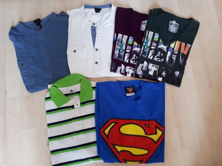 55. Modra in bela majica H&M dolg rokav, velikost M – 2 eur/kos, vijola majica velikost L, zelena velikost XL, Lacoste velikost L – 1eur/kos, Superman velikost XL, nova – 4 eur