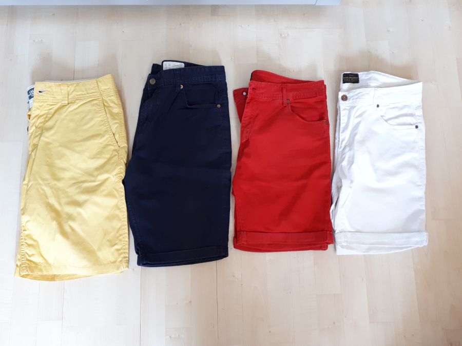 57. Kratke hlače: rumene H&M, velikost 32 – 2 eur, modre, rdeče in bele Zara, velikost 54 (obseg pasu 46) – 3 eur/kos