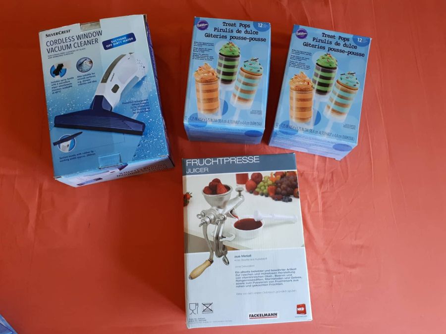 64. Pomivalec oken, samo sproban – 9 eur, modelčki za pecivo, novi, 18 kom – 8 eur, stiskalnica sadja, nova – 4 eur
